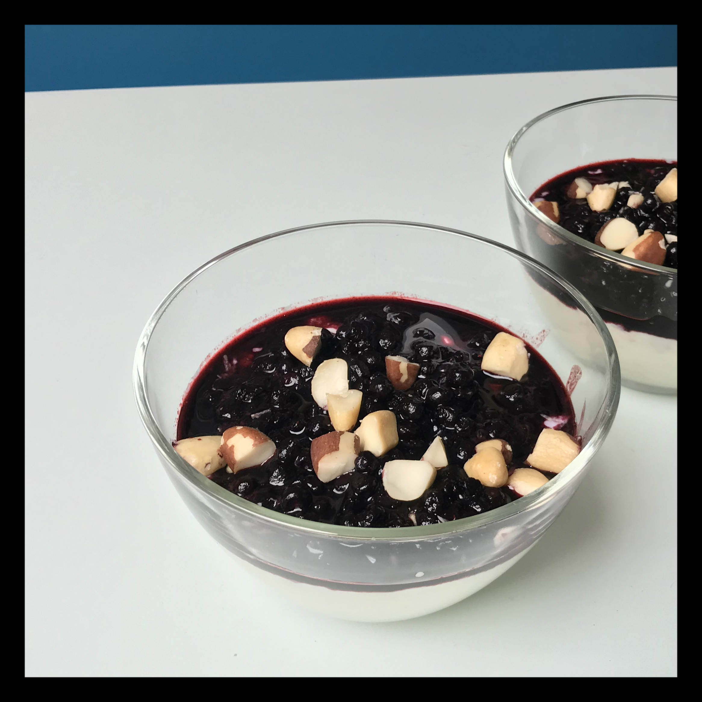 1 geh. EL Reisprotein verrühren, in eine Schüssel geben und die Blaubeeren (incl. dem Saft, der sich gebildet hat) darauf verteilen, dann mit