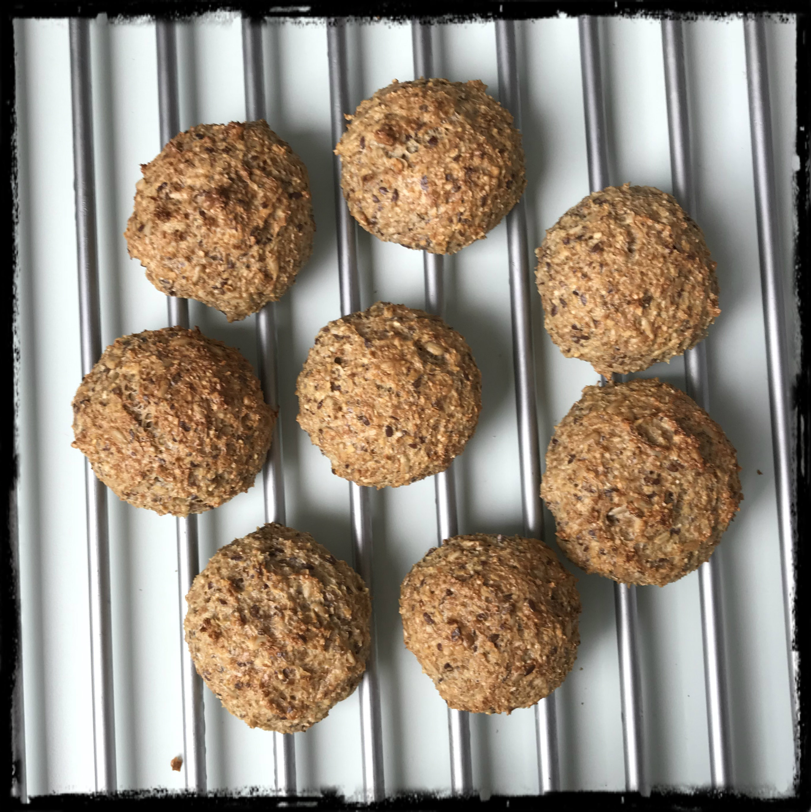 50 g Sonnenblumenkernen unter die Teigmasse mischen, daraus mir nassen Händen etwa 8 Bällchen formen, auf