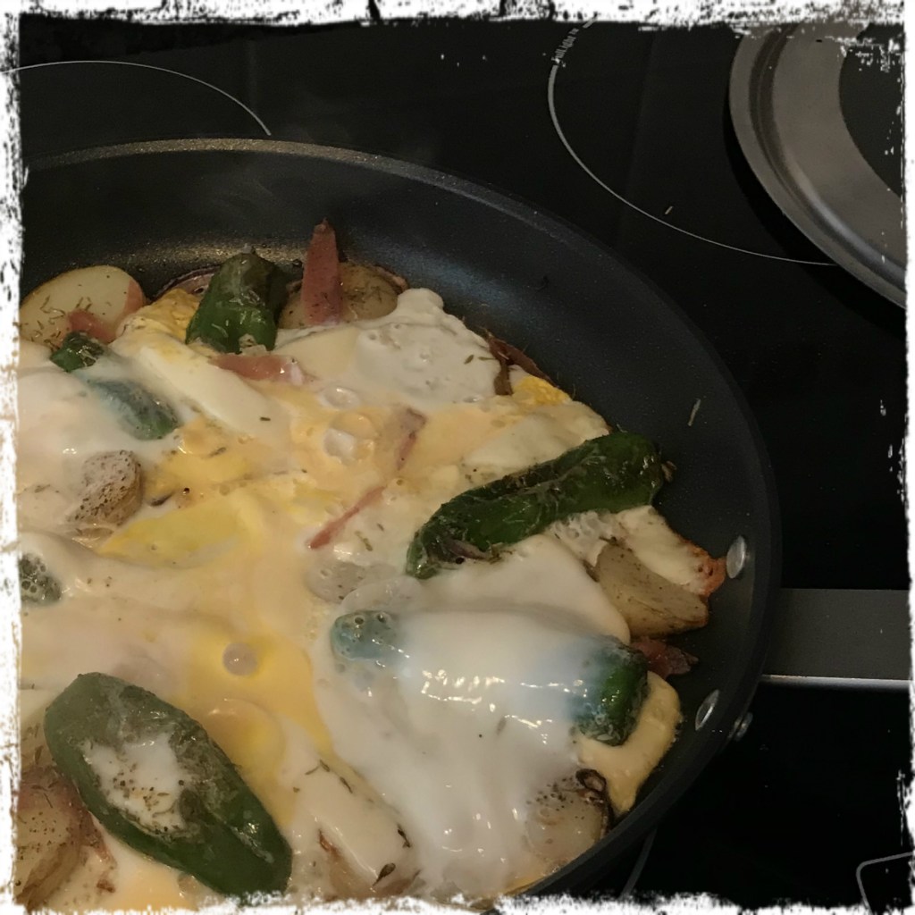 4 Eier (M) aus größerer Höhe in die Pfanne klatschen lassen, die Pfanne mit dem Deckel schließen, die Hitze auf mittelschwach reduzieren und die Eier in ca. 4 Min. stocken lassen, dann ggf. noch etwas