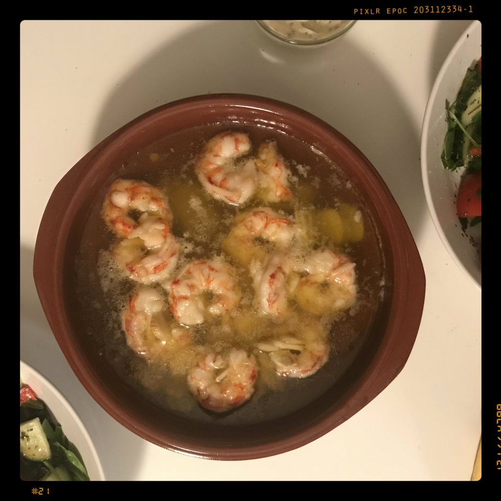ca. 200 ml Bratolivenöl in einer Pfanne stark erhitzen (bis sich am Ende eines Holzlöffels Bläschen bilden) die Garnelen und den Knoblauch in das Öl geben und etwa 5 Min. garen, dann Garnelen und Öl in die Tonform umfüllen und auf einem Holzbrettchen servieren