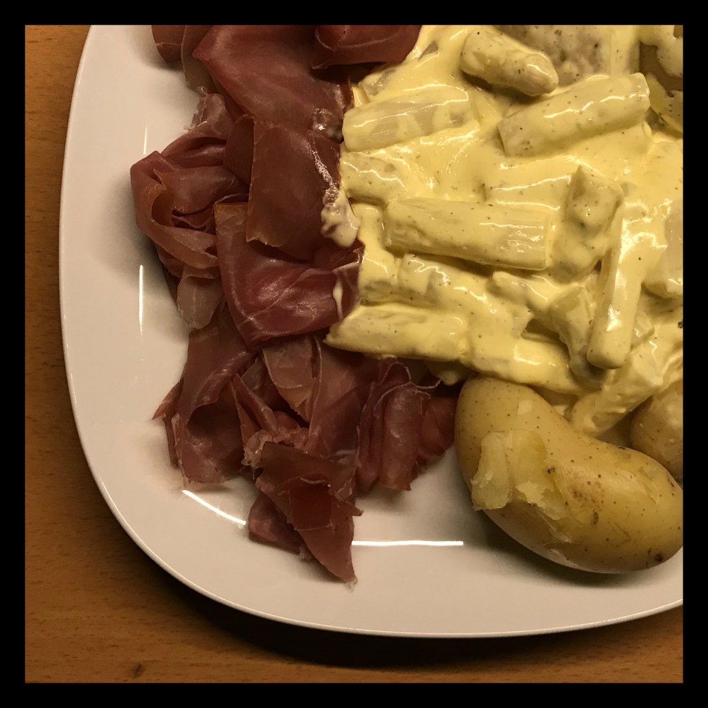 500 g Speisefrühkartoffeln (eher kleinere) nur abbürsten und ca. 20 – 25 Min. gar kochen, derweil
