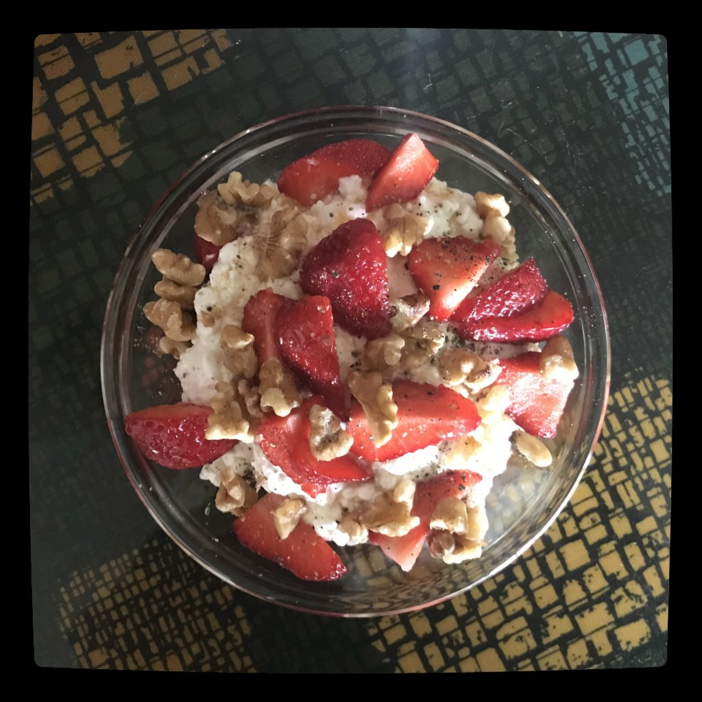 es ist gerade Erdbeerzeit, also gehen Erdbeeren auch zu jeder Tageszeit, mit dem Hüttenkäse ein prima Eiweißlieferant