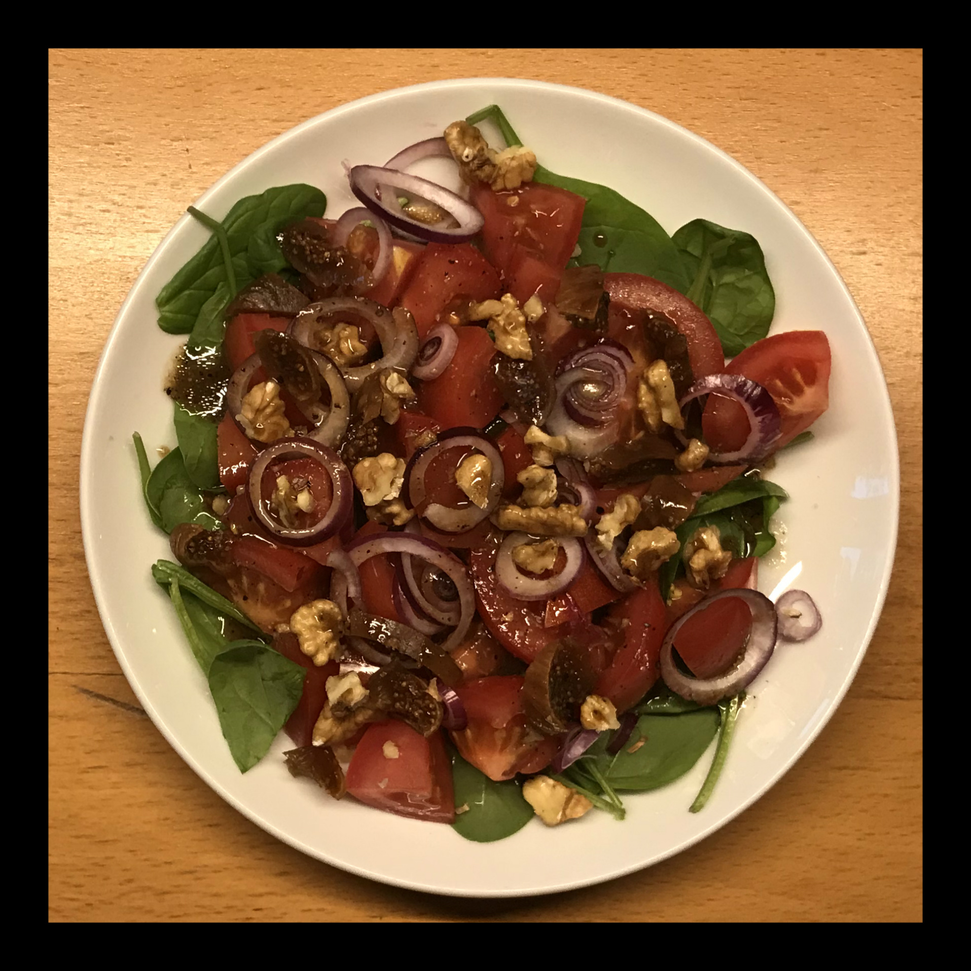 1/2 sehr kl. rote Zwiebel (in feine Ringe geschnitten) auf einem kleinen Teller zu einem Salat anrichten und mit einem Dressing aus