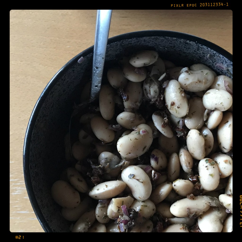 250 g dicke weiße Bohnen (getrocknet) über Nacht in mindestens der doppelten Menge Wasser einweichen, am nächsten Tag die Bohnen abspülen, mit frischem Wasser gut bedeckt kurz aufkochen und 90 Min. bei schwacher Hitze köcheln lassen, abgießen und abkühlen lassen, alternativ 600 g dicke weiße Bohnen (gegart) verwenden