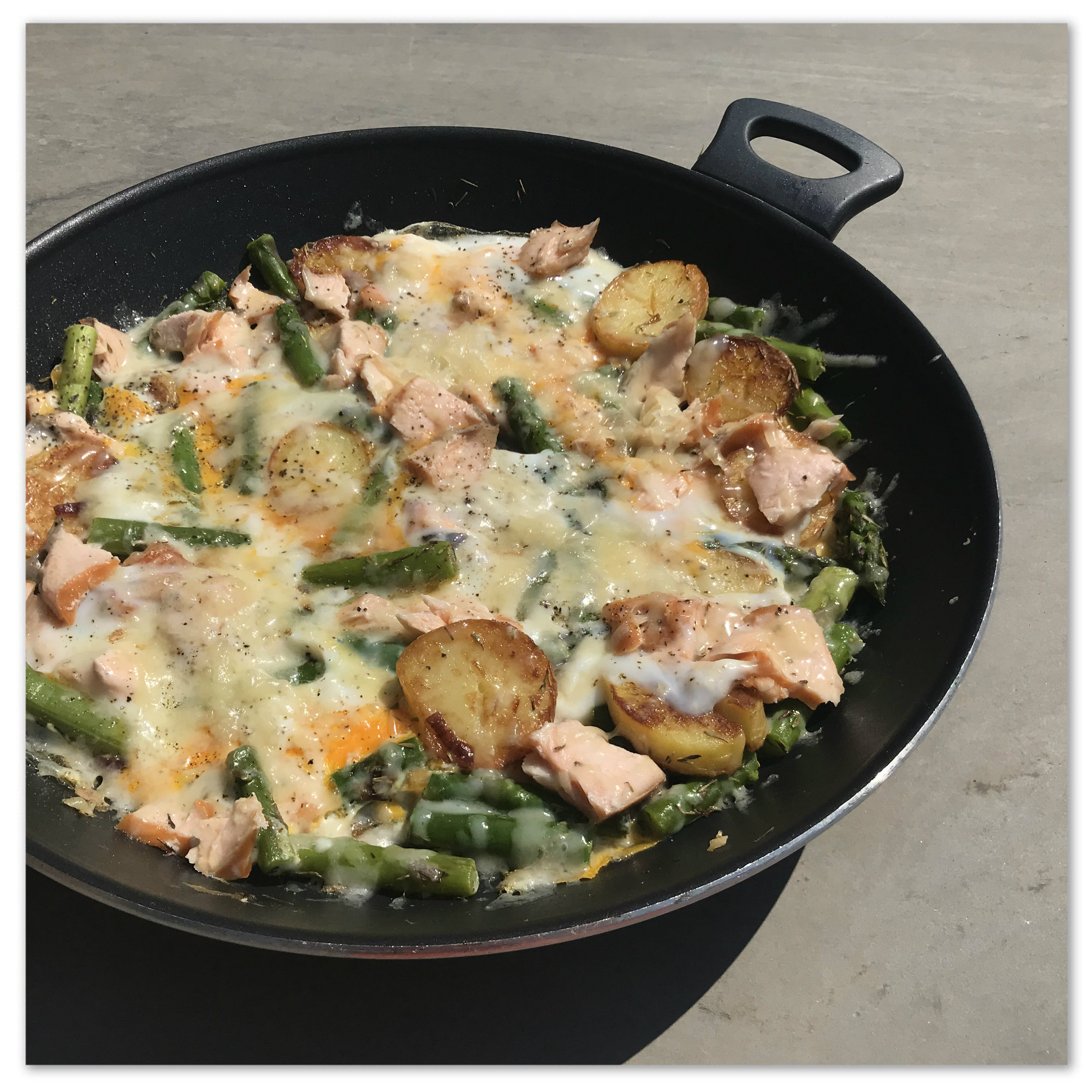 frisch gemahlenem schwarzen Pfeffer würzen und die Pfanne sofort mit dem Deckel schließen, nach ca. 4 Minuten auf mittlere Hitze herunterschalten und noch ein paar Minuten garen, bis die Eier gestockt sind