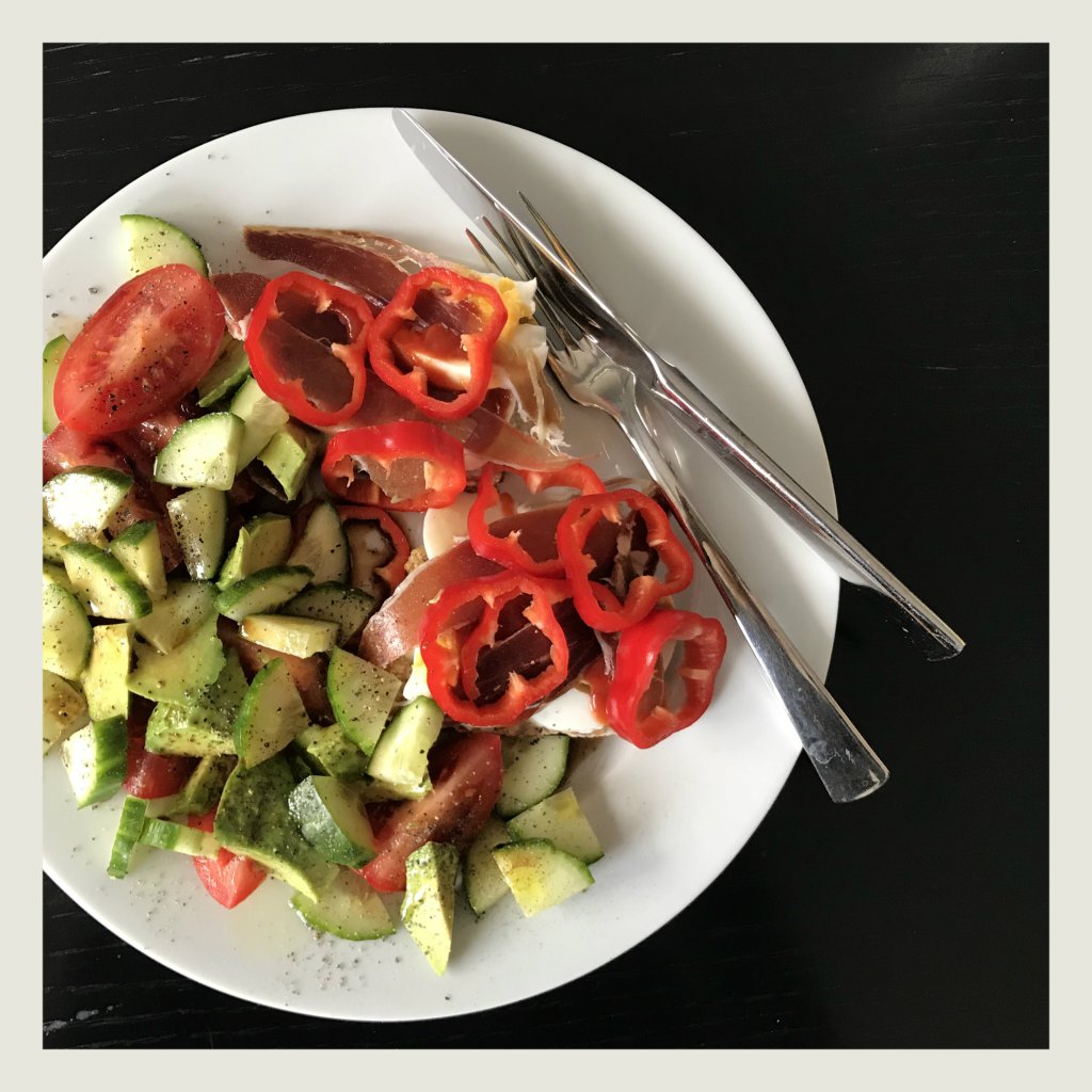 ca. 8 cm Salatgurke (längs geviertelt und in dickere Scheiben geschnitten) zu einem Salat mischen, zu den belegten Broten auf den Teller geben und mit
