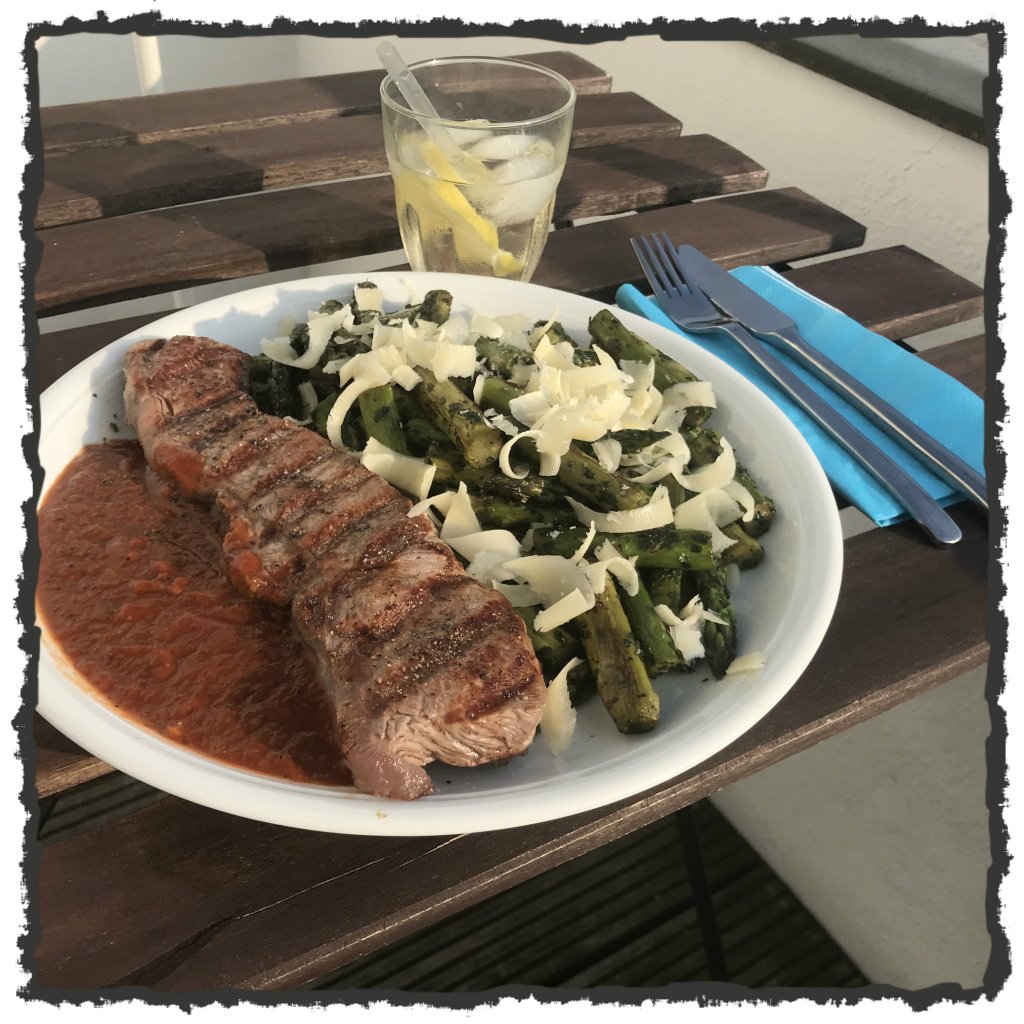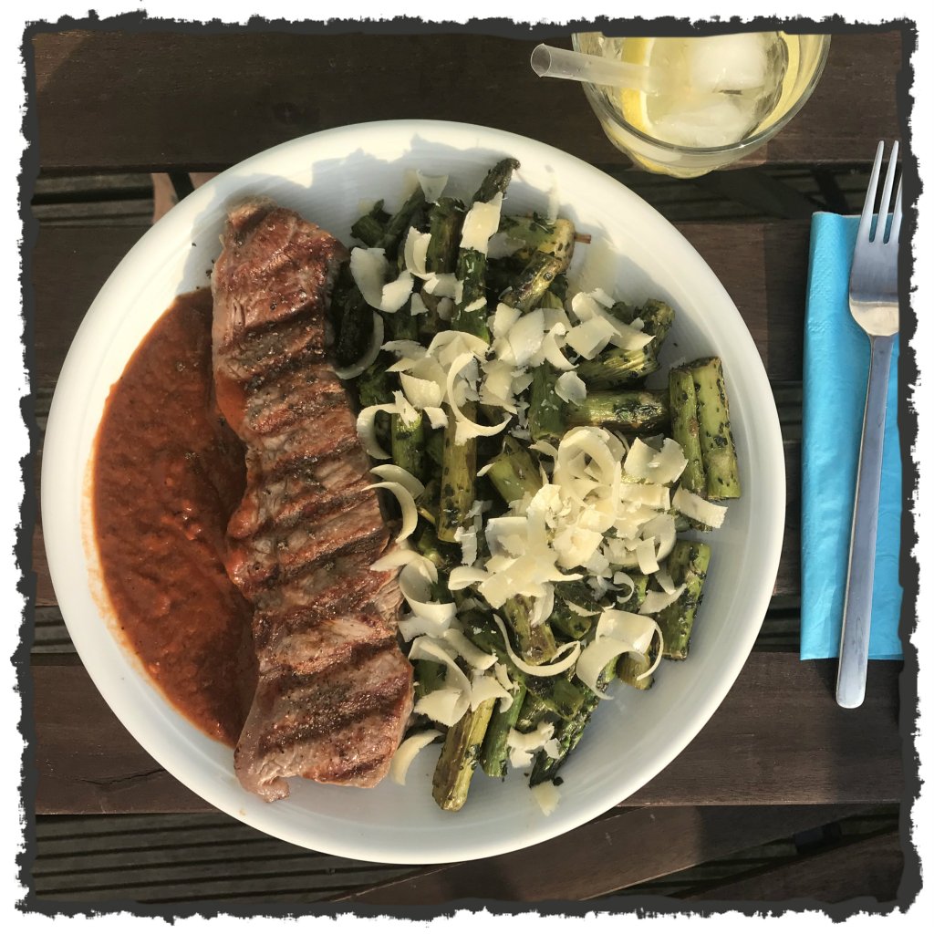 den Spargel auf einen vorgewärmten Teller geben und mit dem Parmesan bestreuen, dann das Rumpsteak daneben setzen und die BBQ-Sauce dazu geben