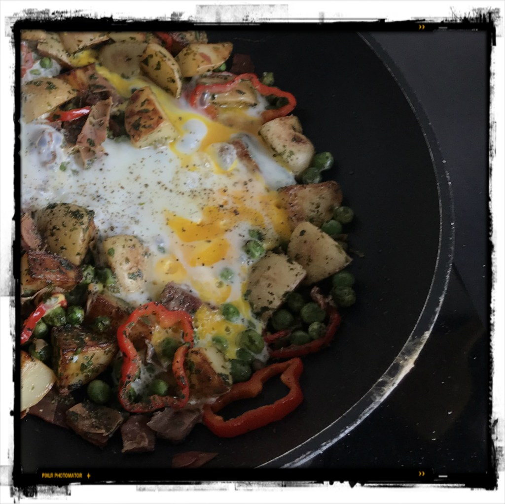 frisch gemahlenem schwarzen Pfeffer würzen und die Pfanne sofort mit dem Deckel schließen, nach ca. 2 Minuten auf mittlere Hitze herunterschalten und noch ein paar Minuten garen, bis die Eier gestockt sind