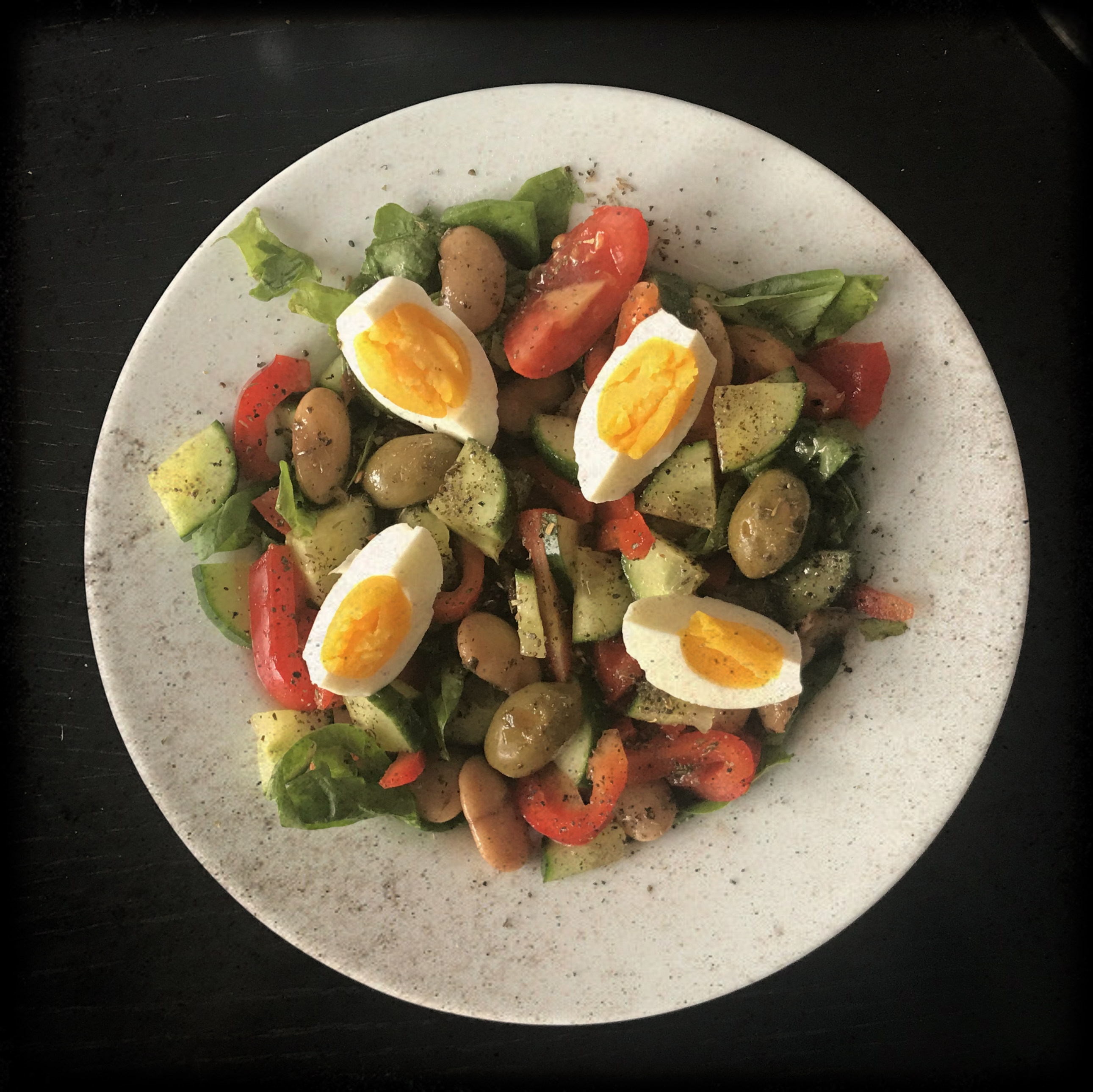 etwa 1/8 (ca. 3 geh. EL) des Griechischen dicke Bohnen-Salates (Rezept siehe 29. Mai 2018) verwenden und mit weiteren Zutaten ergänzen