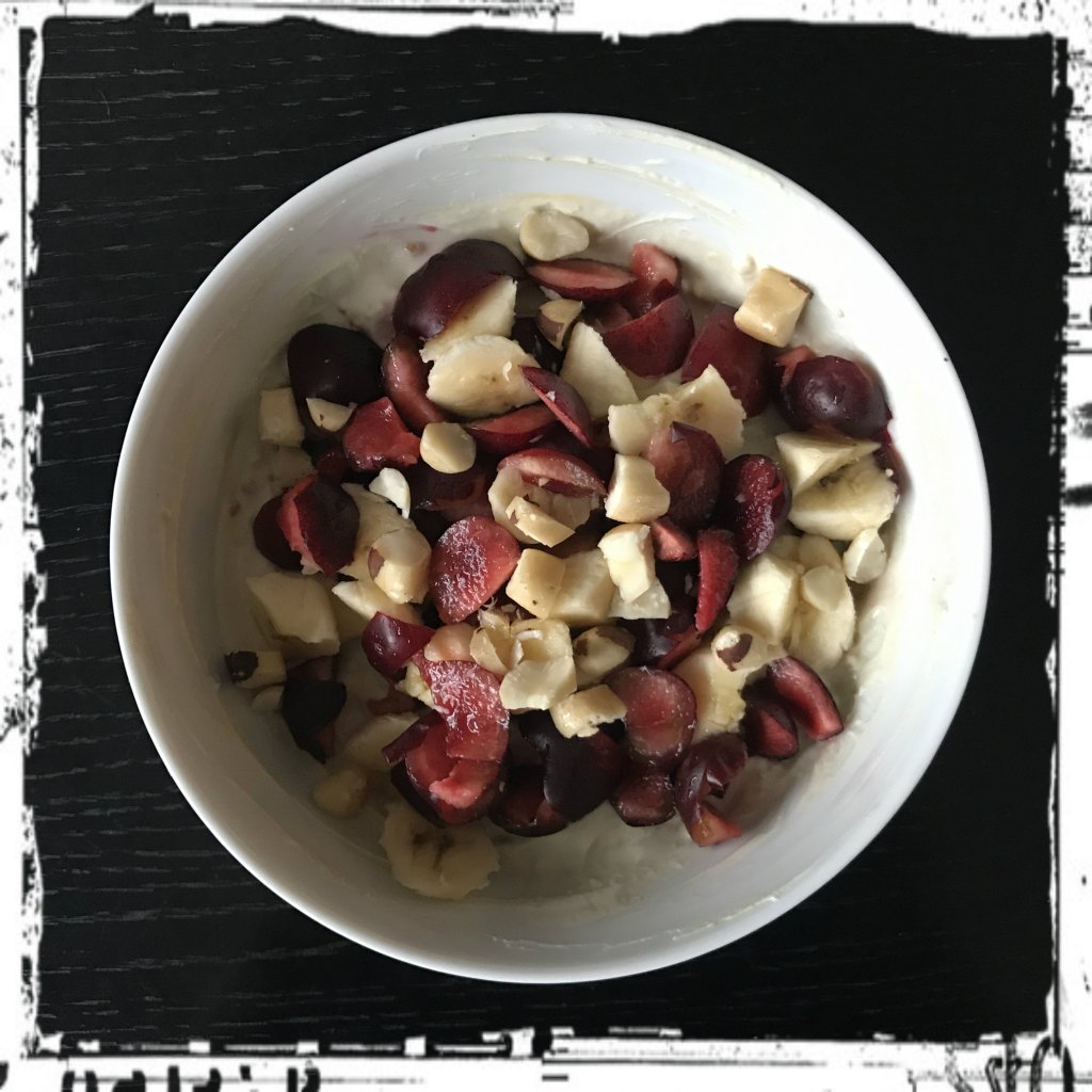 1/2 Banane (in kleine Stücke geschnitten) darüber geben und mit