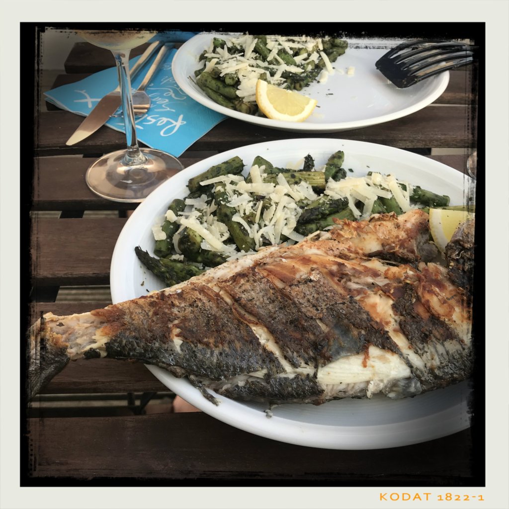 den Spargel auf zwei vorgewärmte Teller aufteilen und mit dem Parmesan bestreuen, und die Zitronenhälften dazu geben, die Dorade dann auf einen der Teller geben, so dass derjenige, der sie besser zerlegen kann, eine Hälfte auf den zweiten Teller weitergeben kann