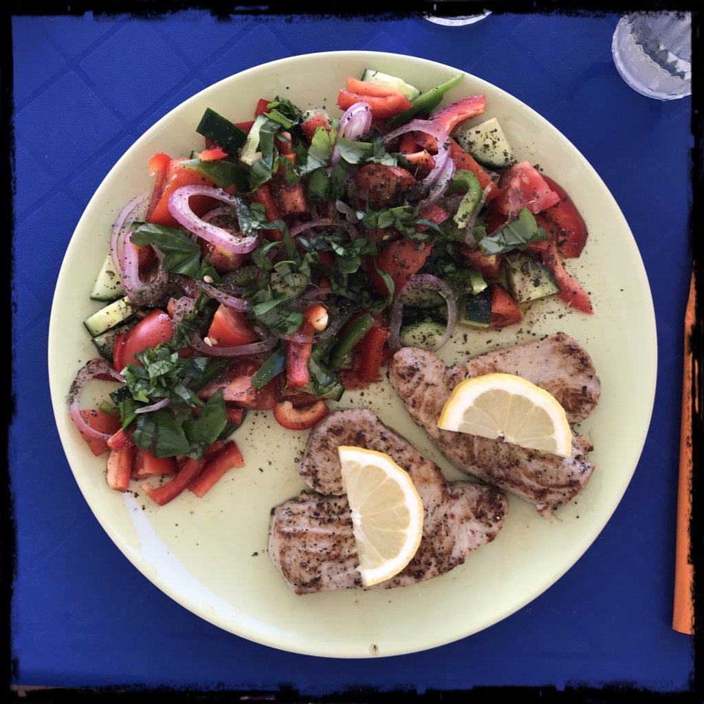 frisch gemahlenem schwarzen Pfeffer würzen, zum Salat geben und mit den Zitronenscheiben belegen