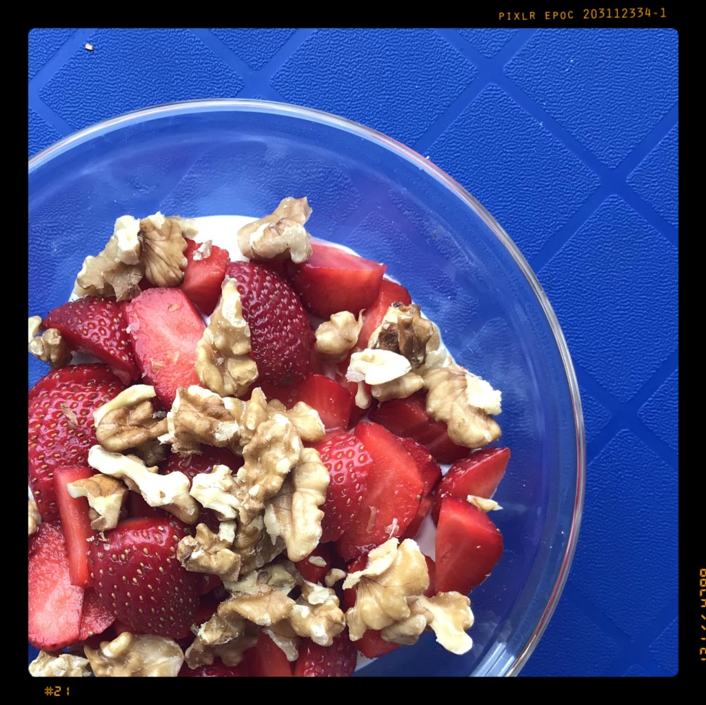 200 g Erdbeeren vierteln und auf den Joghurt geben, dann