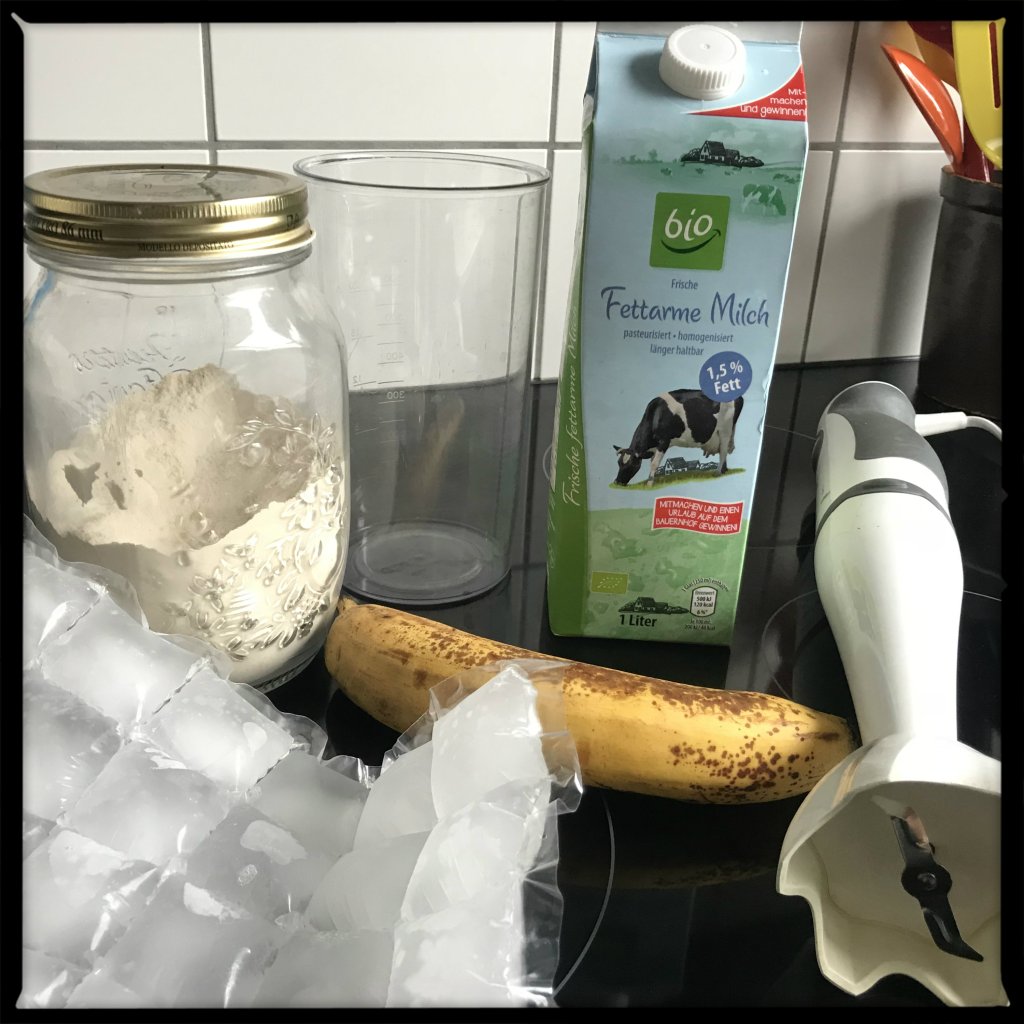 4 Eiswürfel hinzufügen und mit dem Mixstab zu einem Shake verarbeiten