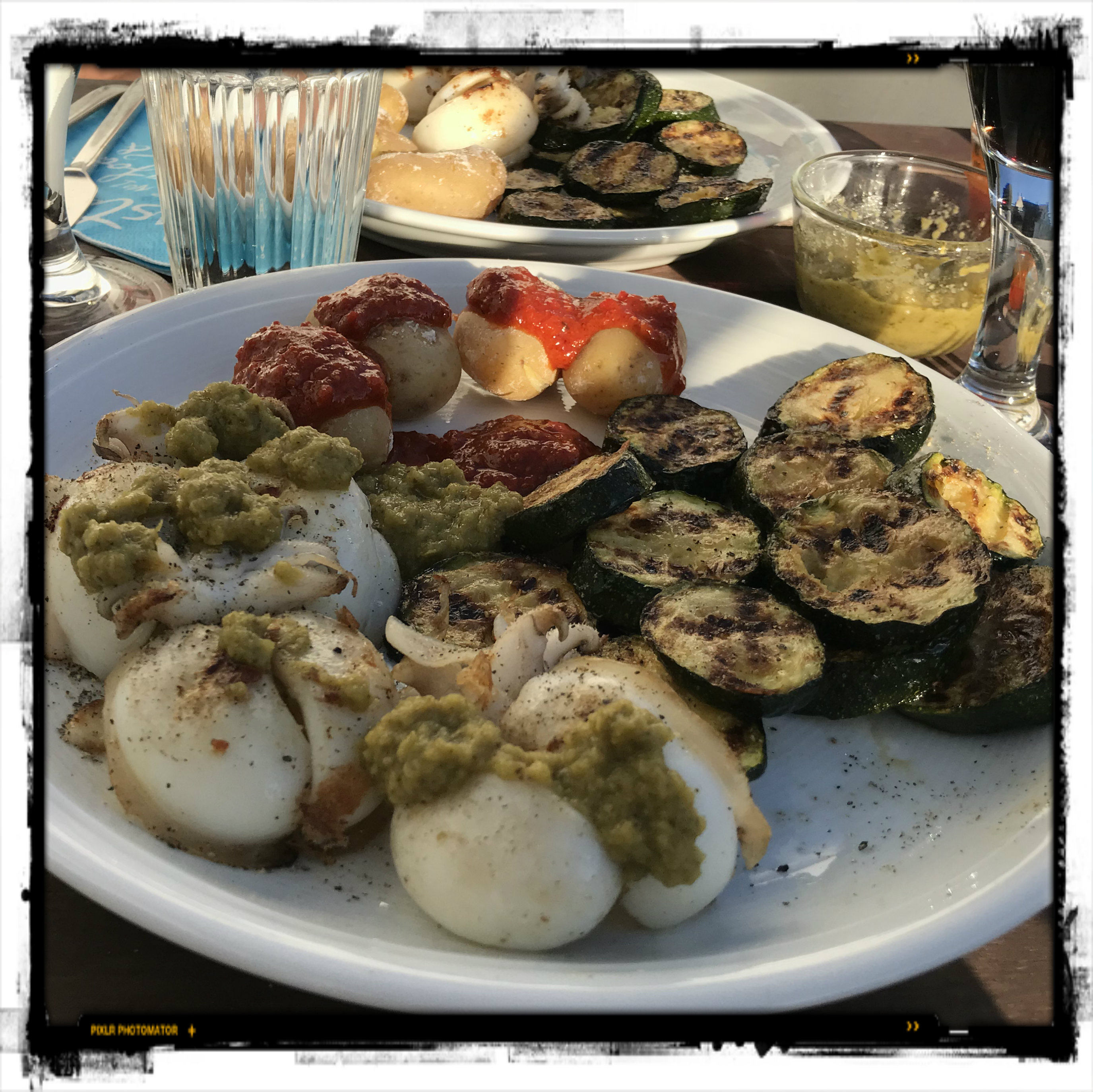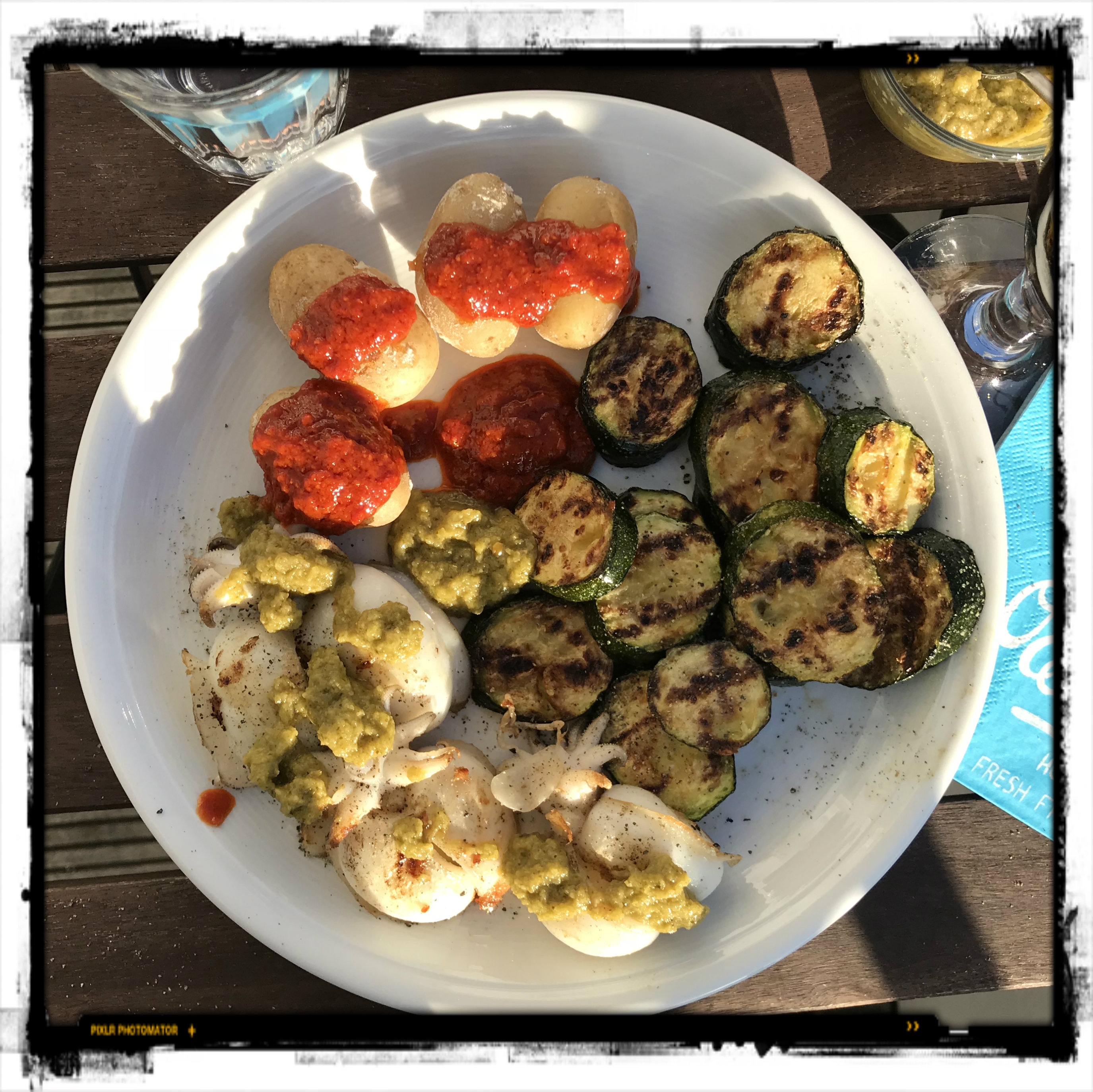 die Zucchini unter mehrfachen Wenden ca. 20 Min. grillen, nach ca. 10 Min. die Sepia dazu legen und ebenfalls unter mehrfachem Wenden grillen