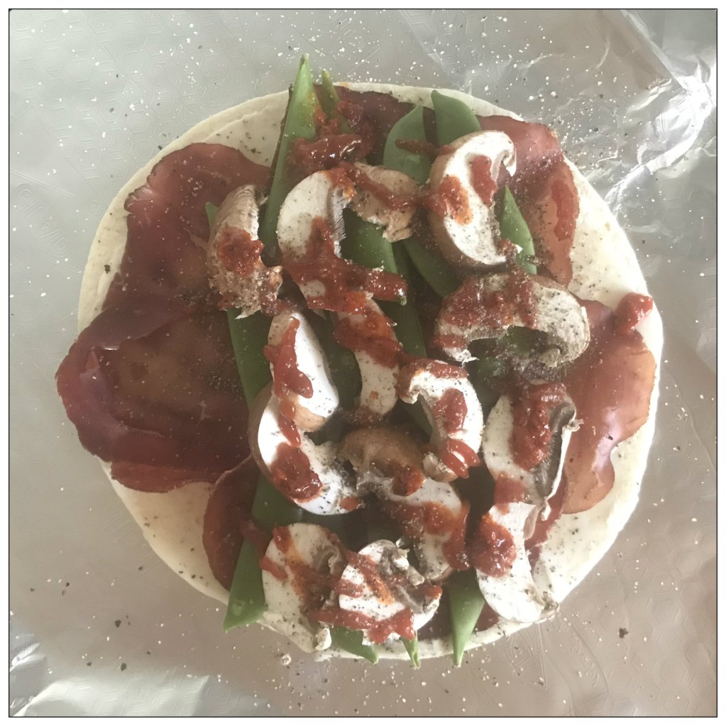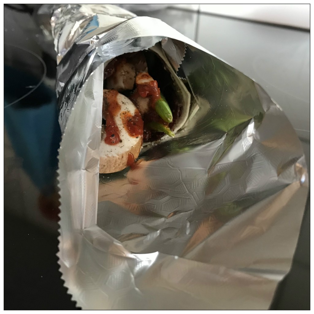 frisch gemahlenem schwarzen Pfeffer würzen, zu einem Wrap fest zusammenrollen und in