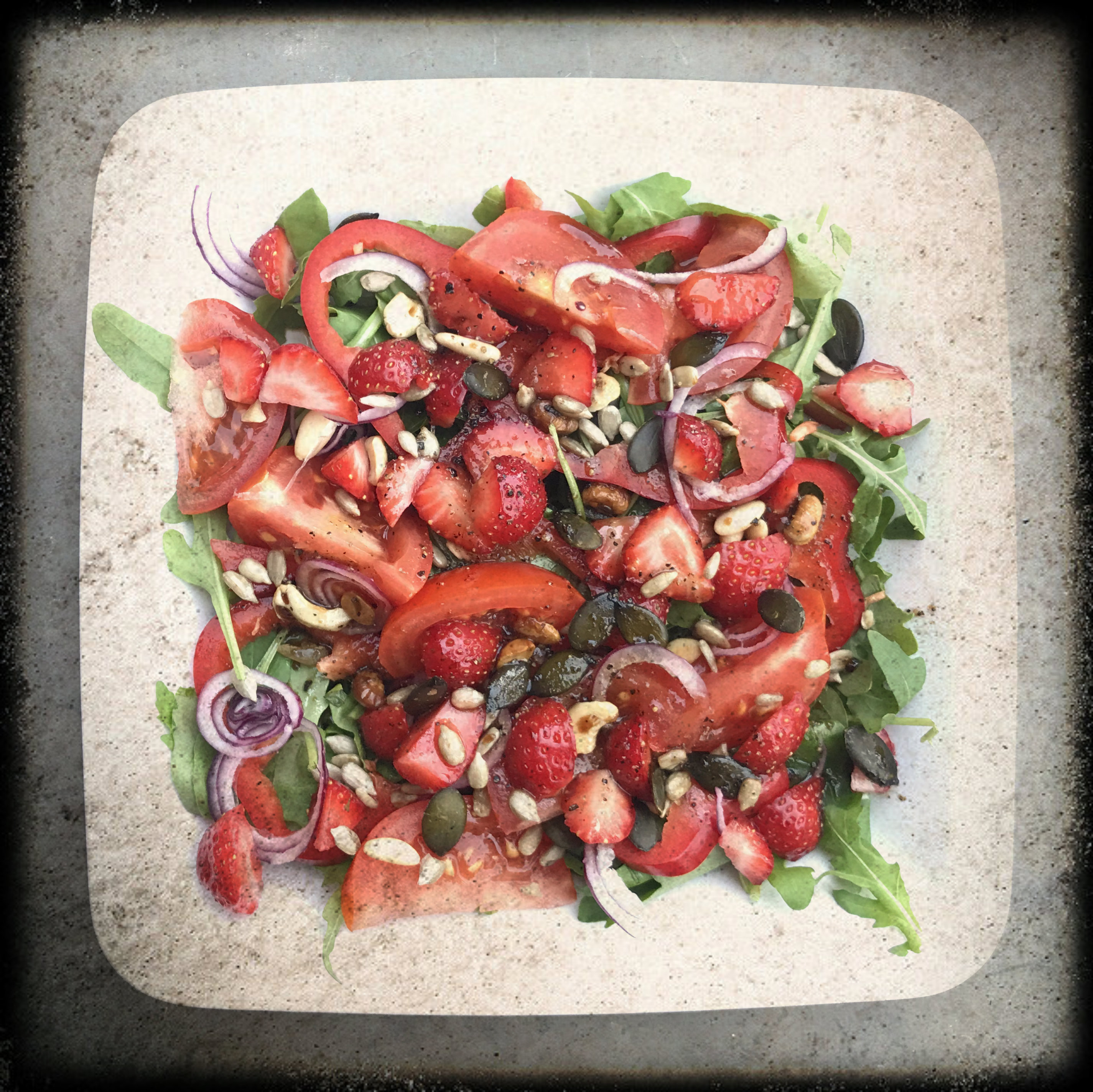 ca.100 g kleinere Erdbeeren (geviertelt) auf zwei Tellern verteilen und mit einem Dressing aus