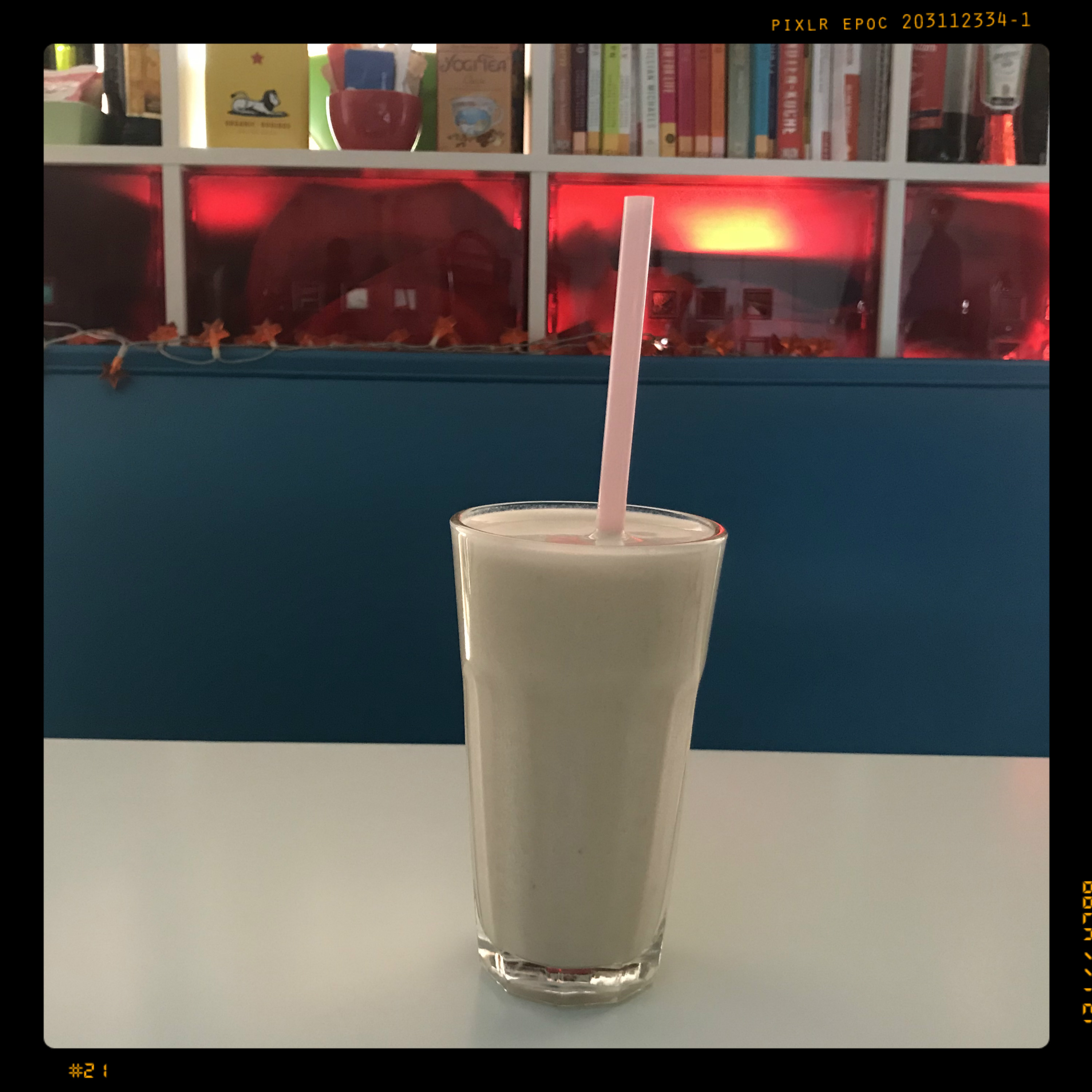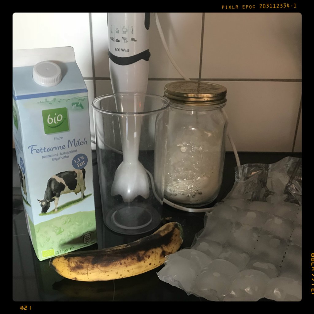 4 Eiswürfel hinzufügen und mit dem Mixstab oder im Standmixer zu einem Shake verarbeiten