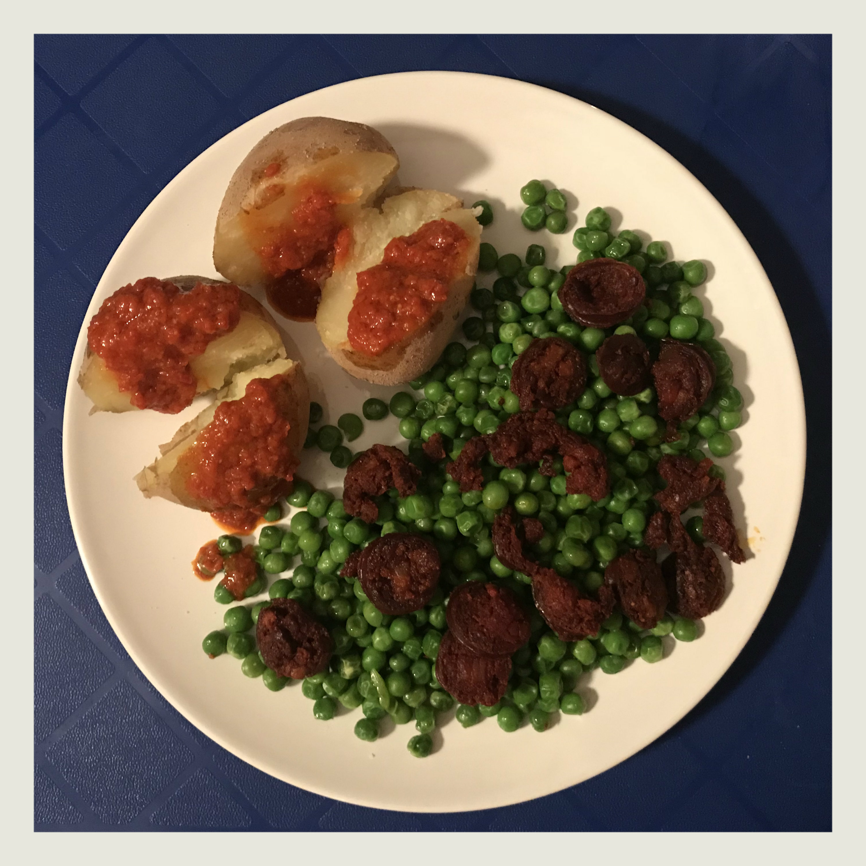 Küchenkrepp geben, dann die Erbsen auf einen großen vorgewärmten Teller geben und die Chorizo-Scheiben darauf verteilen, die Kartoffeln dazu legen und mit