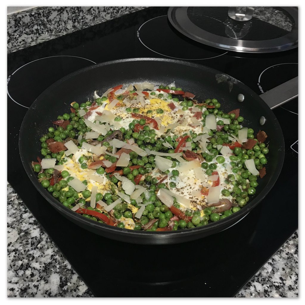 1 EL Bratolivenöl in der Pfanne mittelstark erhitzen, den Schinken kurz anbraten, dann die Erbsenmischung darauf verteilen und