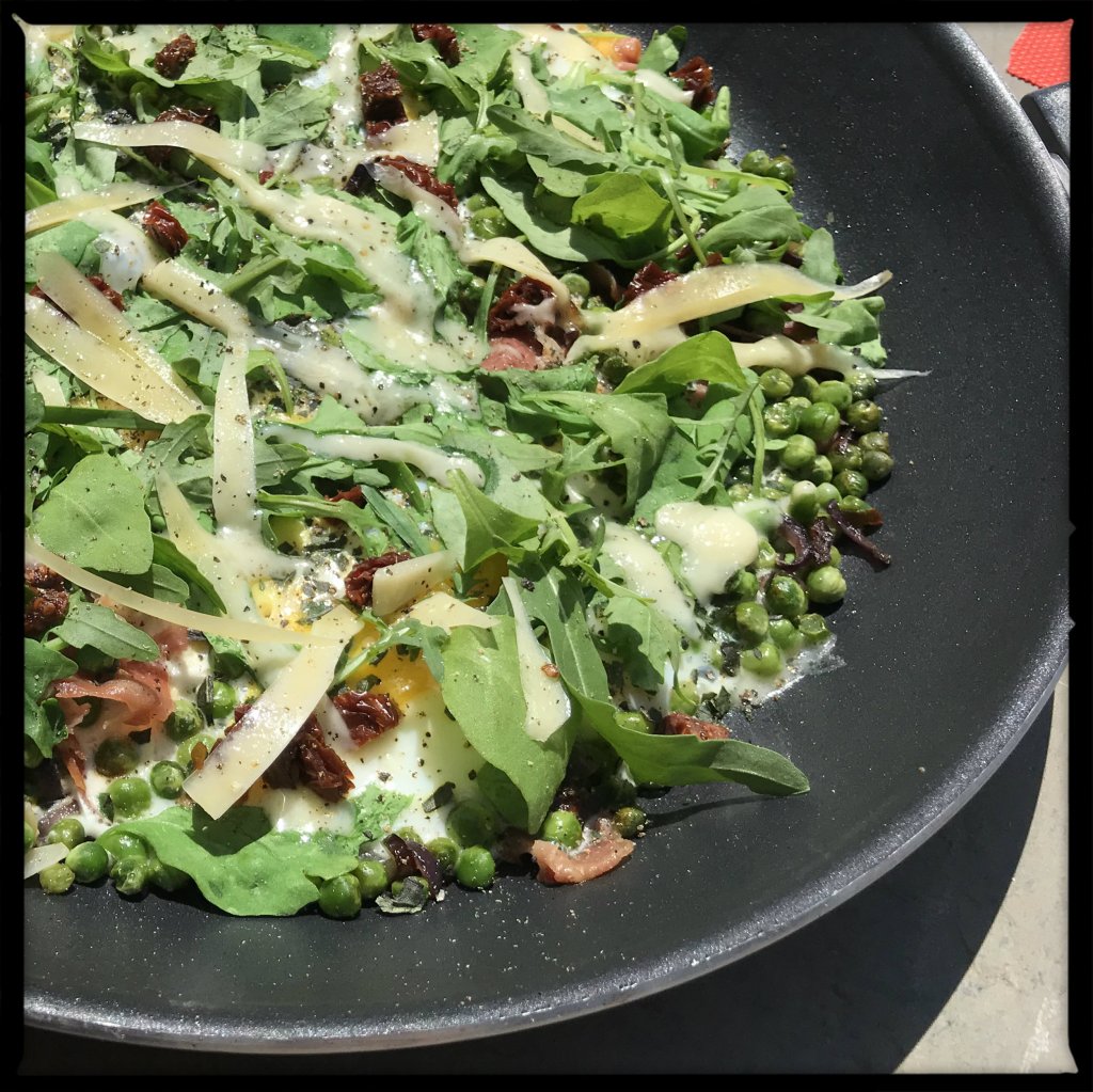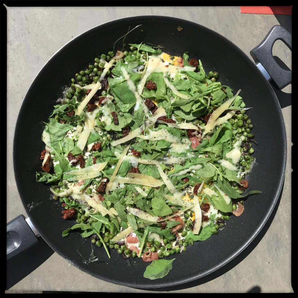 1 EL Bratolivenöl bei mittelstarker Hitze kurz anbraten, die Erbsenmischung und die getrockneten Tomaten sowie