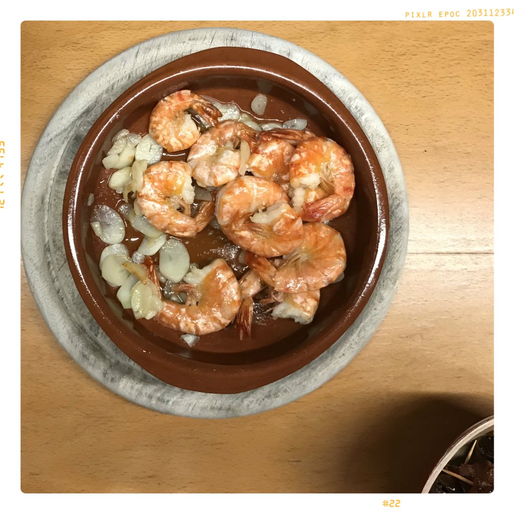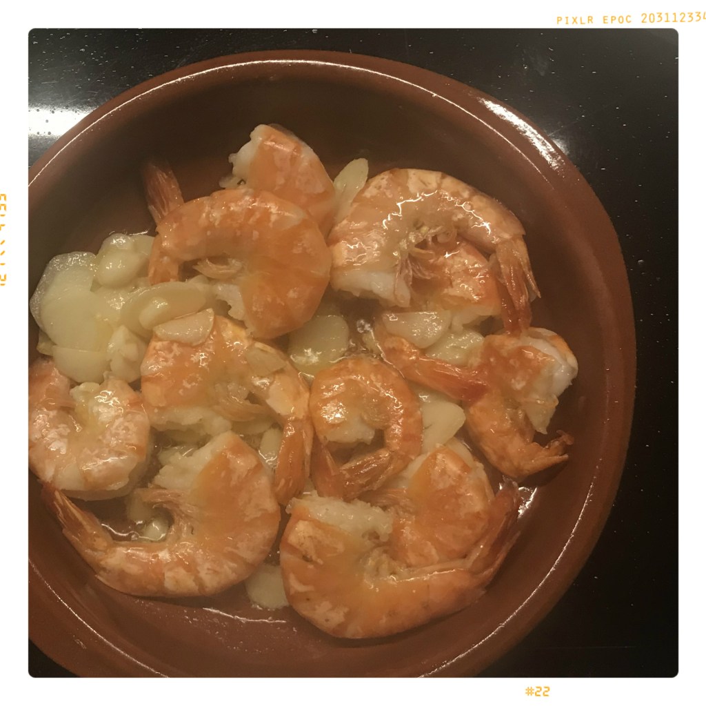 die Gambas in eine gut vorgewärmte Tonform (oder andere Schüssel) füllen und z. B. mit dem Knoblauchmöhren (vom 18. August 2018) und ggf. etwas Baguette servieren