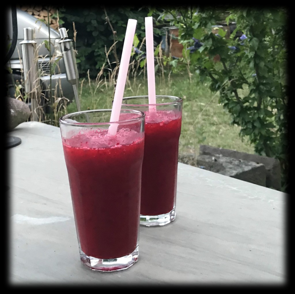 20 Eiswürfel im Mixer fein zerkleinern, auf zwei Gläser (ca. 350 ml Inhalt) verteilen und mit