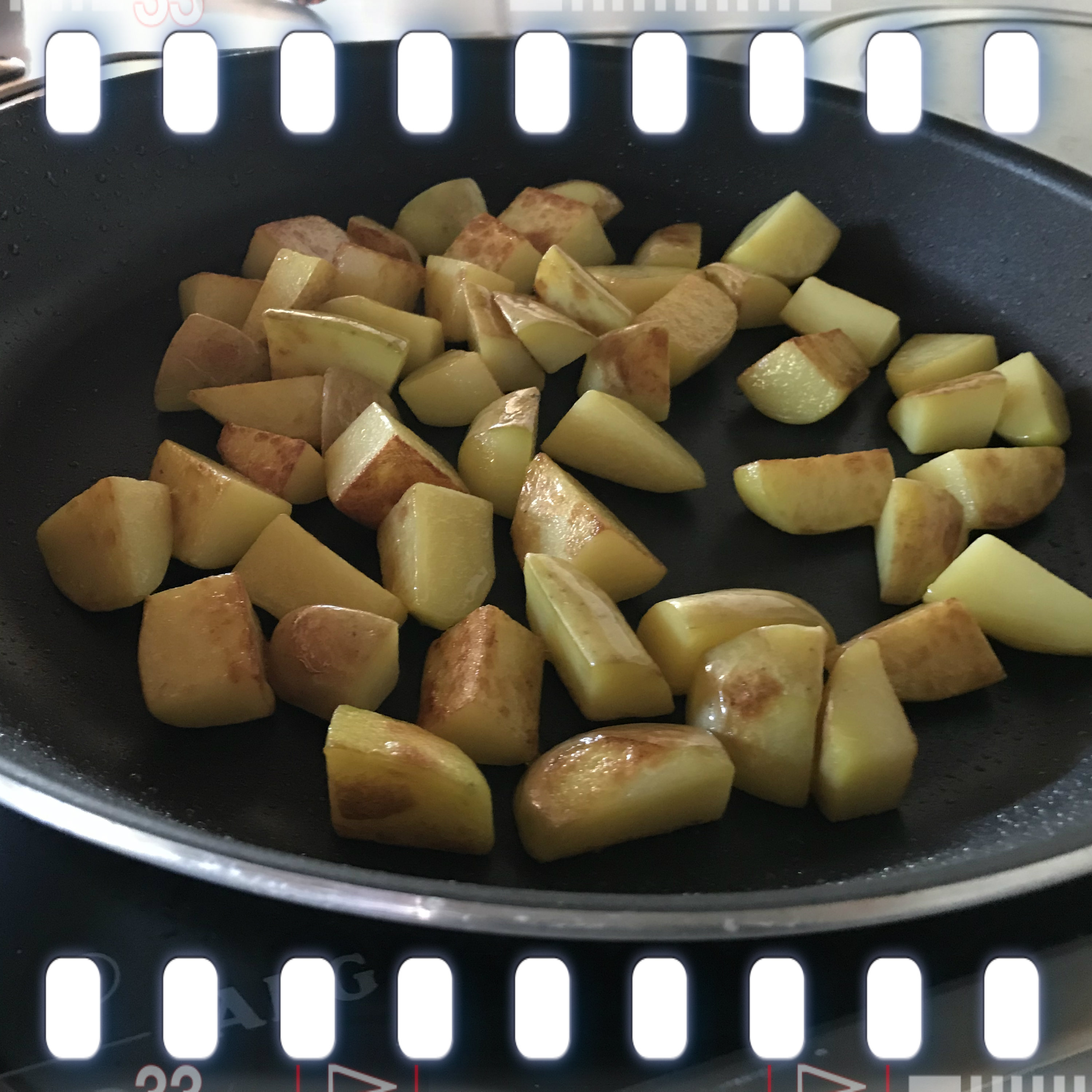 ca. 360 g festkochende Kartoffeln (eher kleine) je nach Größe längs vierteln oder sechsteln, dann halbieren und in einer geschlossenen Pfanne in