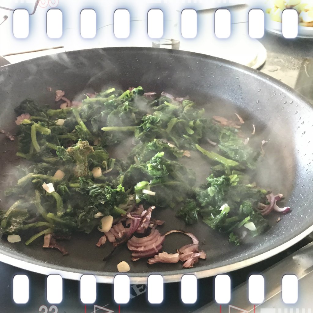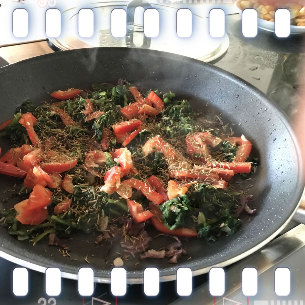 1 EL Brat-Olivenöl bei mittlerer Hitze ca. 3 Min. braten, dann den Spinat (gut ausgedrückt) hinzugeben, kurz weiterbraten und anschließend mit den Paprikastreifen und