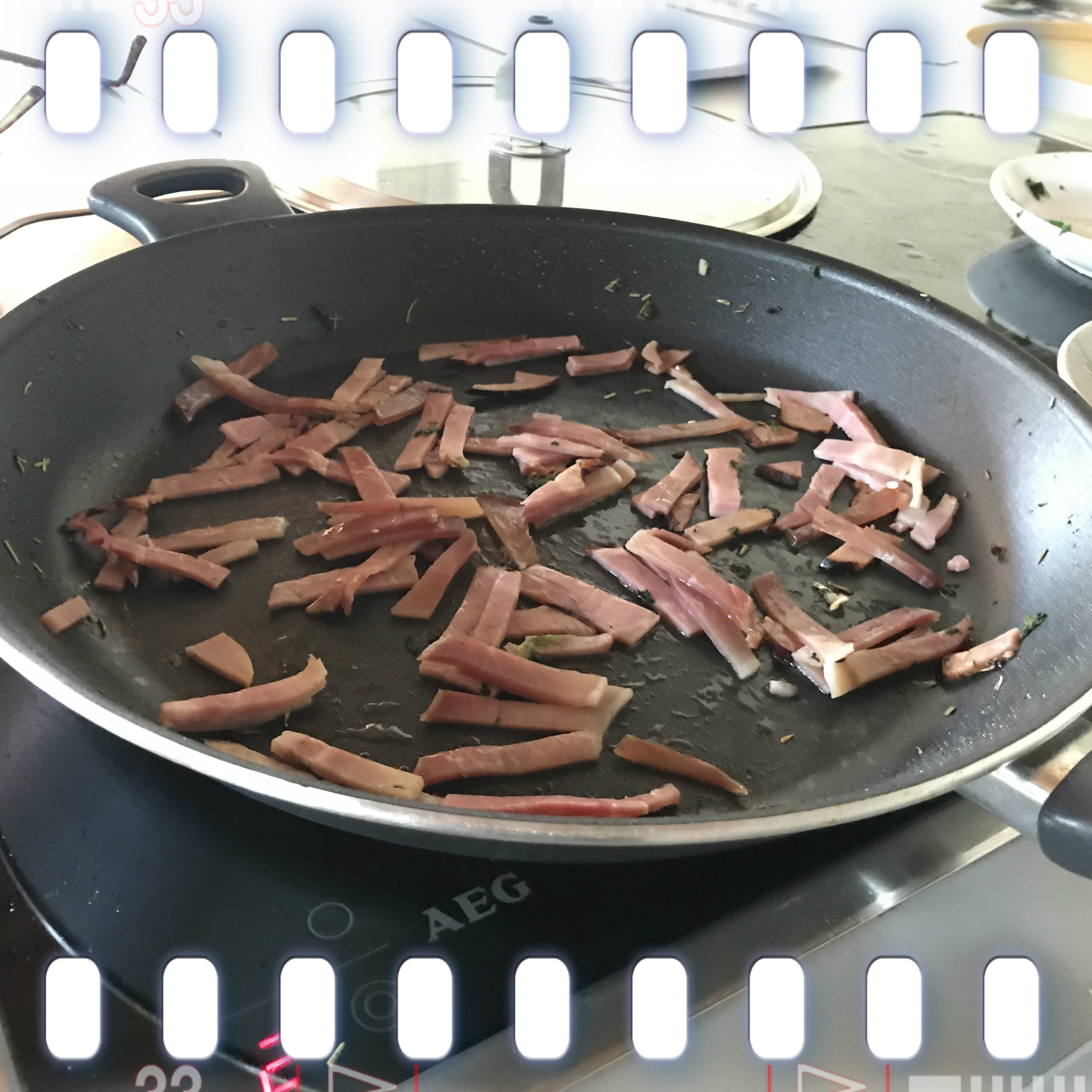 50 g luftgetrockneten Schinken in dünne Streifen schneiden,