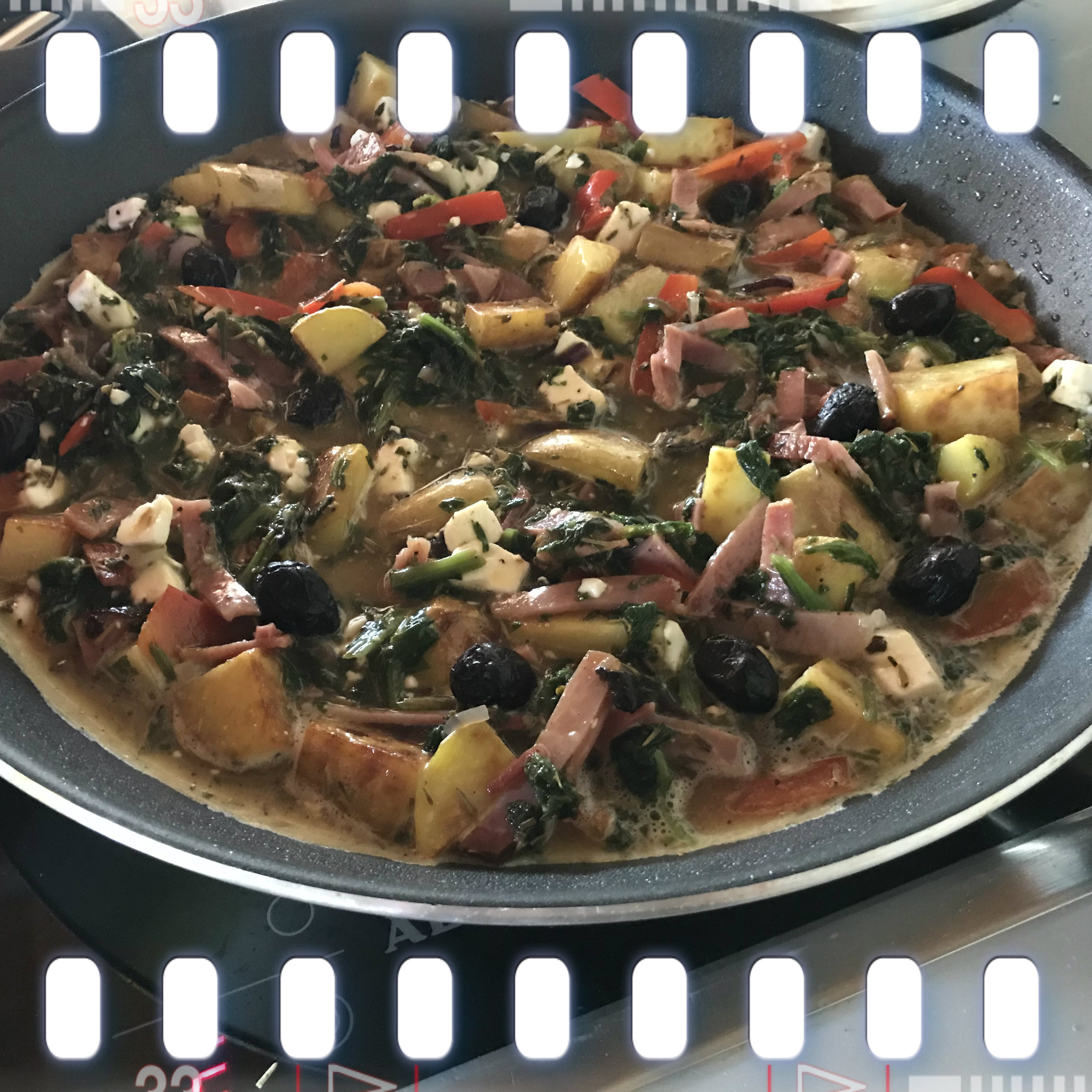 frisch gemahlenem schwarzen Pfeffer mit dem Schneebesen kurz durchschlagen und mit der Gemüse-Schinken- und Kartoffelmischung sowie dem Feta und