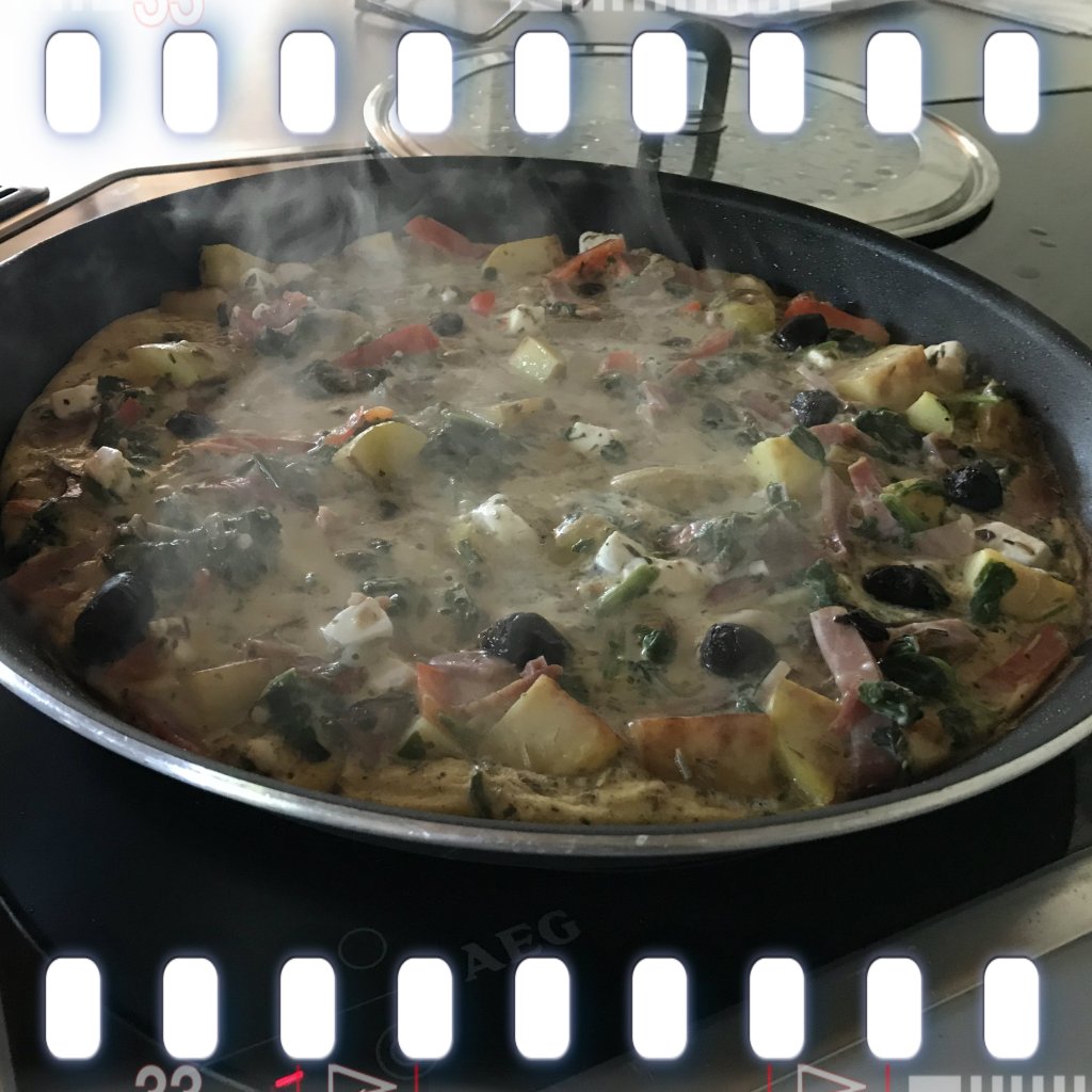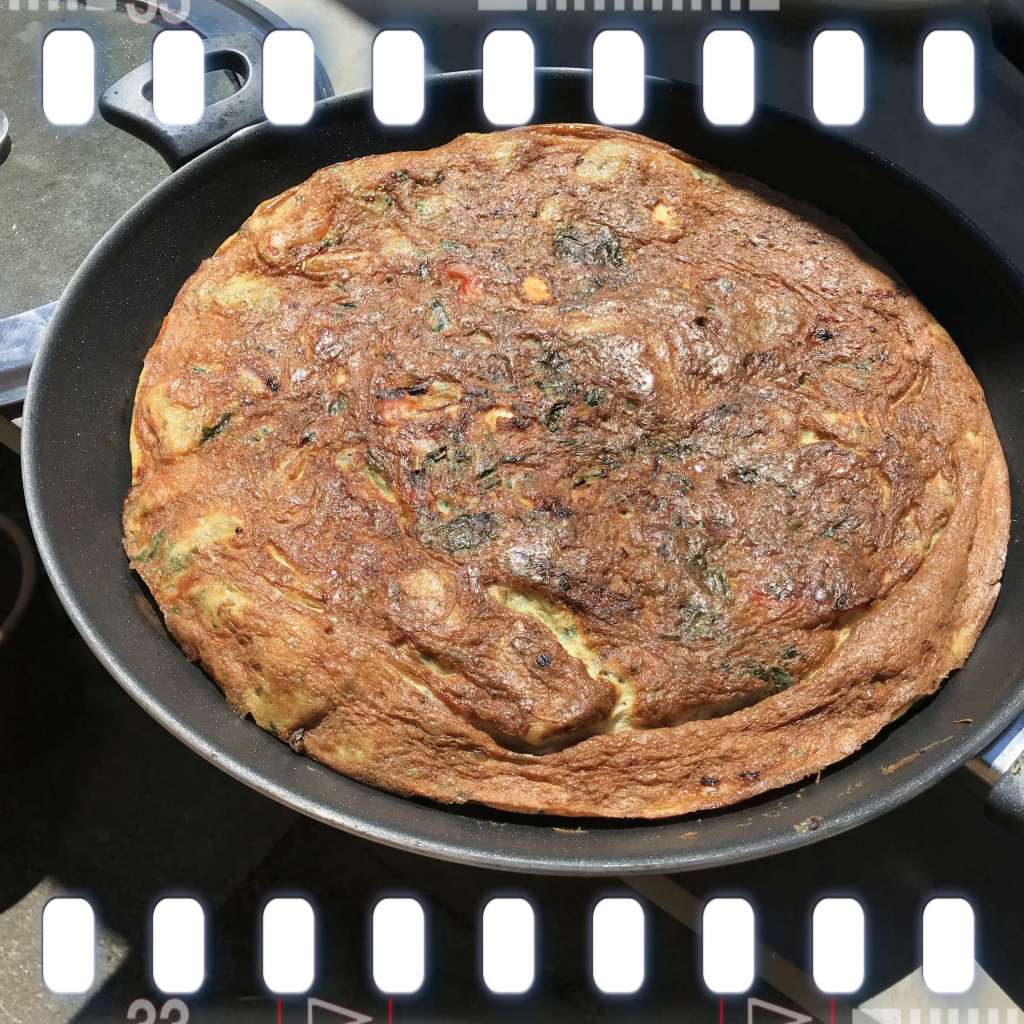 1 EL Brat-Olivenöl in der Pfanne mittelstark erhitzen, die Ei-Mischung hineingießen und die Pfanne sofort mit dem Deckel schließen, nach ca. 4 Min. die Hitze auf mittelschwach reduzieren, weitere 10 Min. garen, bis die Oberfläche gestockt ist, dann die Tortilla über den Deckel wenden und noch ca. 4 Min. bei mittelstarker Hitze fertig braten