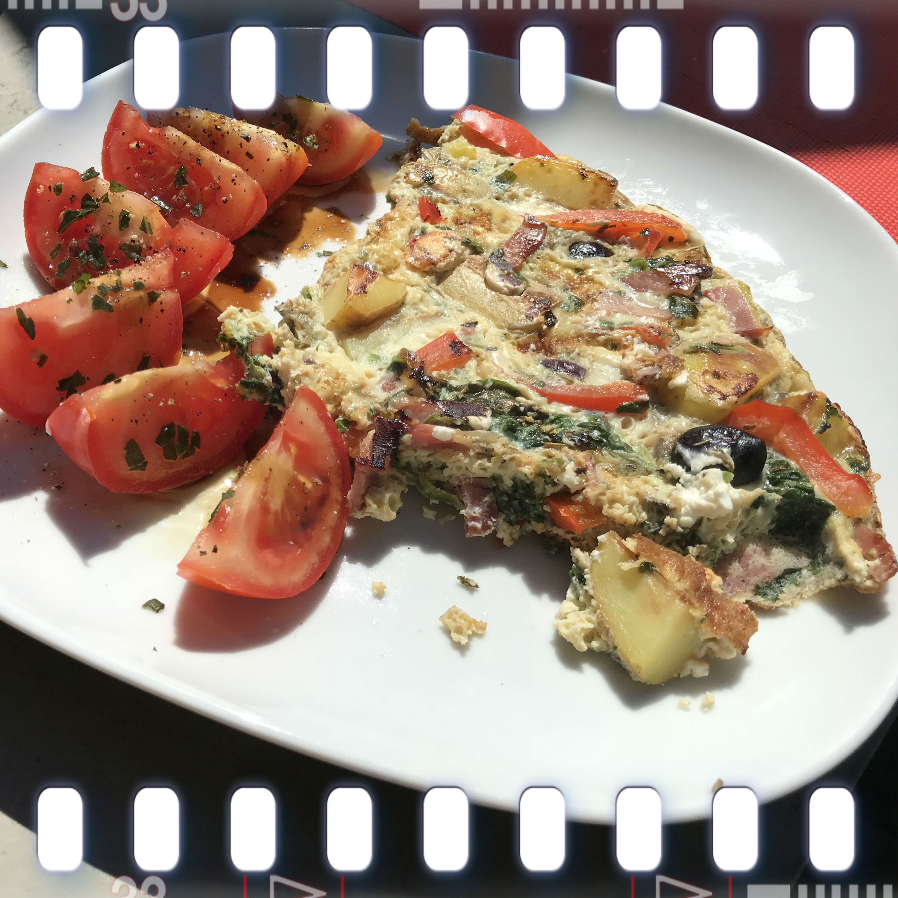 die Tortilla in drei oder vier (Torten-)Stücke teilen und auf vorgewärmten Tellern z. B. mit ein paar Tomaten (mit TK Basilikum bestreut) servieren