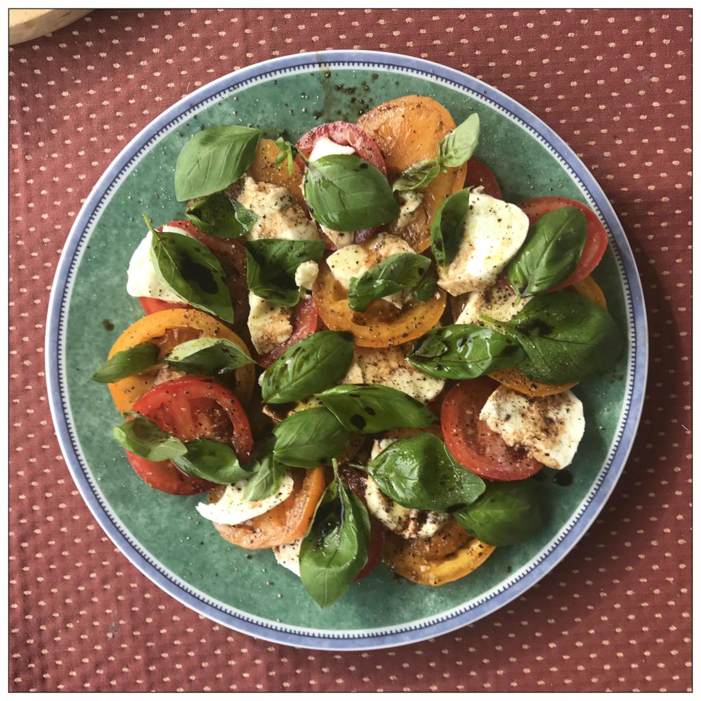 125 g Mozzarella in Scheiben schneiden (die Scheiben ggf. halbieren), auf die Tomatenscheiben legen bzw. teilweise dazwischen schieben, alles mit