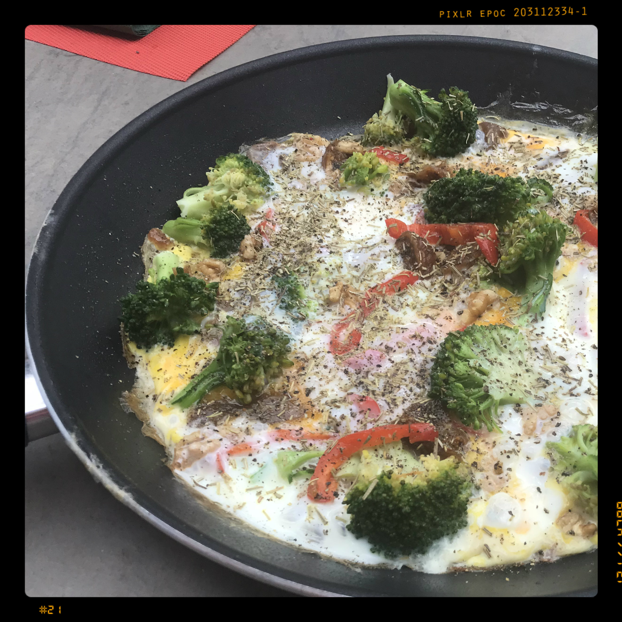 frisch gemahlenem schwarzen Pfeffer würzen und die Pfanne sofort mit dem Deckel schließen, nach ca. 2 Minuten auf mittlere Hitze herunterschalten und noch ein paar Minuten garen, bis die Eier gestockt sind