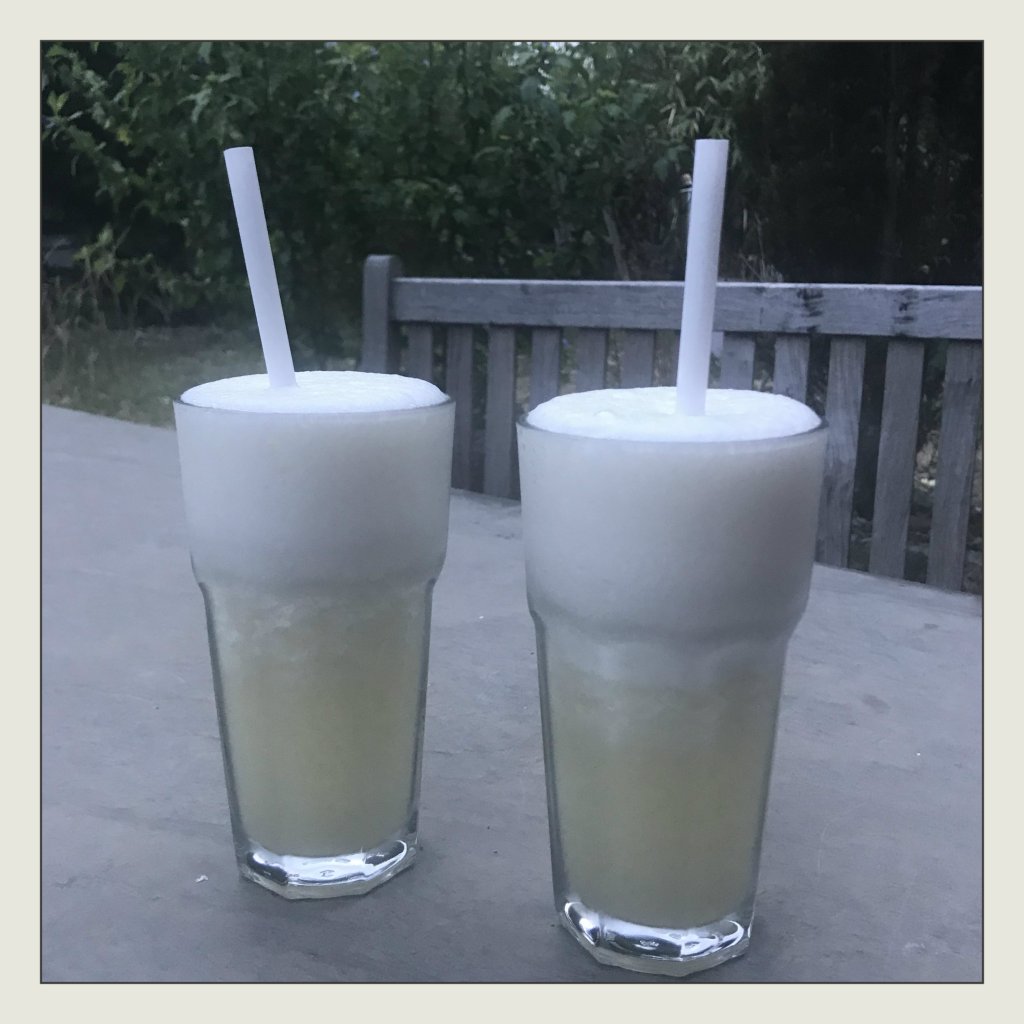 20 Eiswürfel geben und alles so lange mixen, bis das Eis ausreichend zerkleinert ist, in zwei große Gläser (ca. 350 ml) geben und mit Trinkhalmen servieren