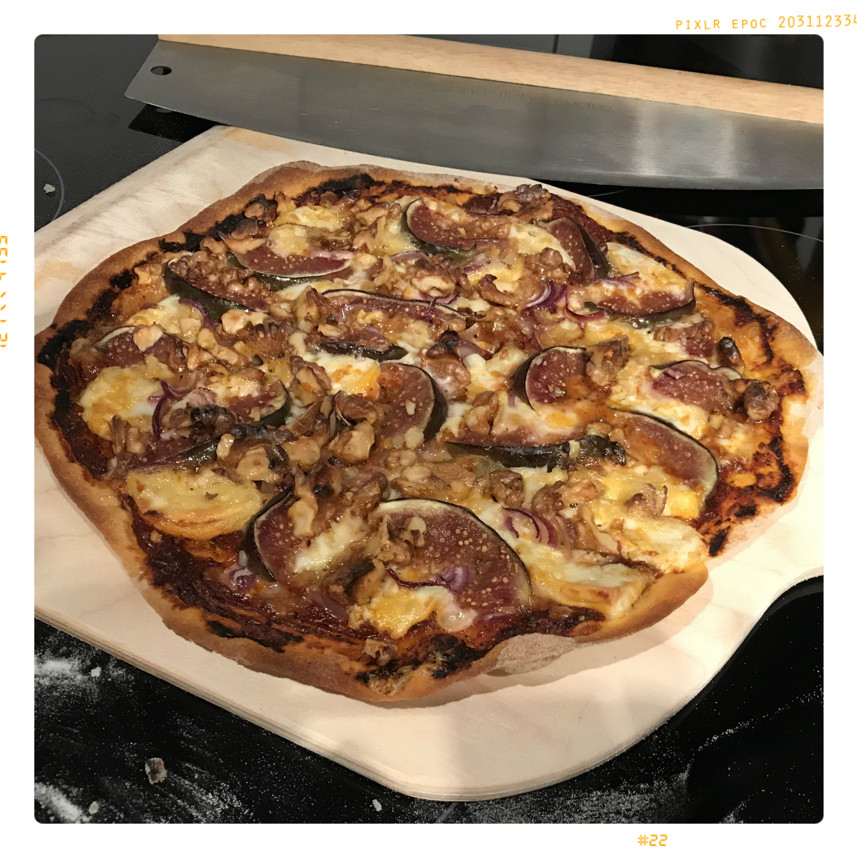 bemehlten Pizzaschieber gleichmäßig dünn ausrollen, mit der Tomatensauce bestreichen, den Emmentaler und den Ziegenkäse darauf verteilen, dann mit Feigen, Zwiebeln und Walnüssen belegen, alles mit