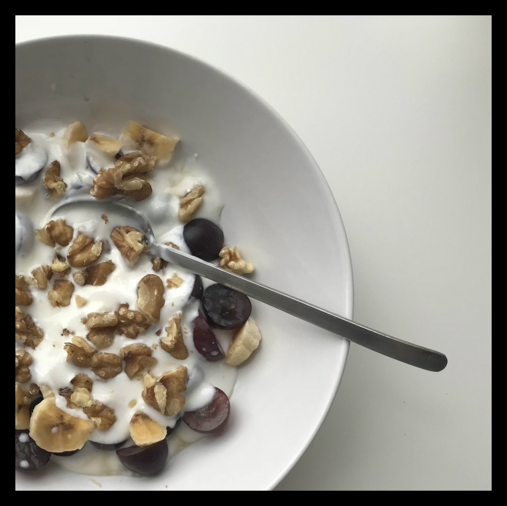 1 Handvoll blauen Weinbeeren (halbiert) leicht unter den Joghurt mischen, dann mit
