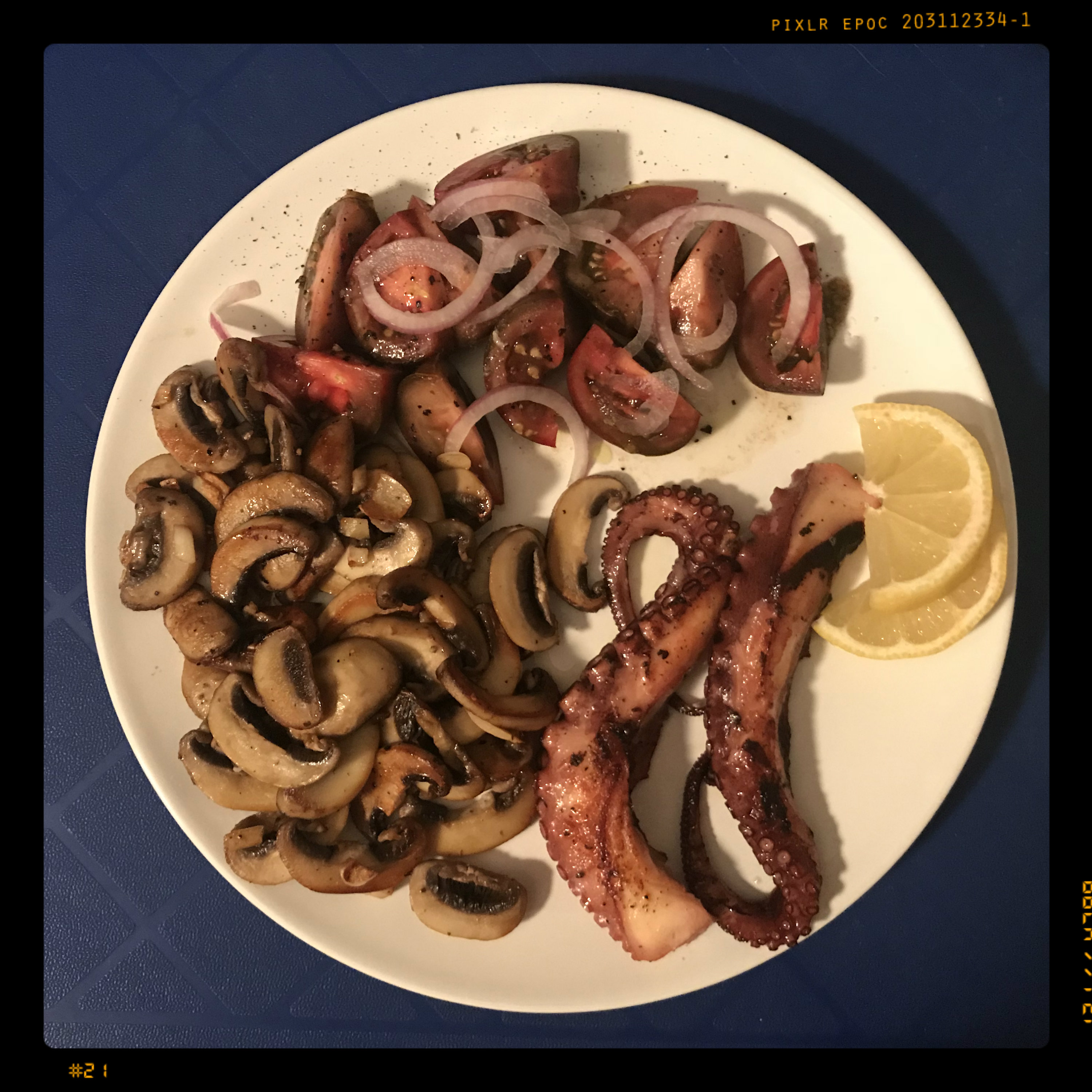 frisch gemahlenem schwarzen Pfeffer würzen, zum Tomatensalat auf den Teller geben und mit den Zitronenscheiben servieren, vor dem Verzehr den Tintenfisch mit der Zitrone beträufeln