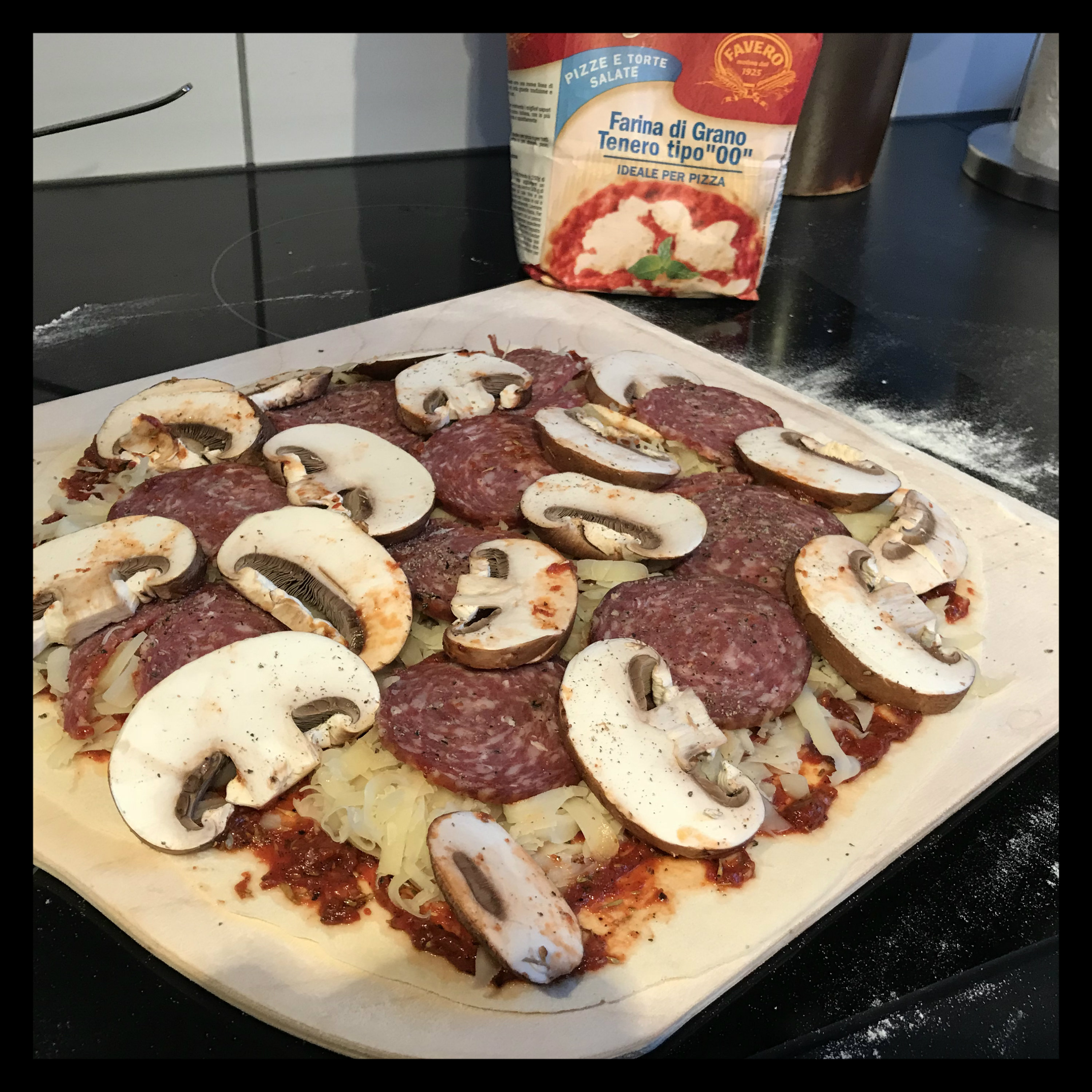 bemehlten Pizzaschieber gleichmäßig dünn ausrollen, mit der Tomatensauce bestreichen und den Käse darauf verteilen, dann mit Salami und Champignons belegen, alles mit