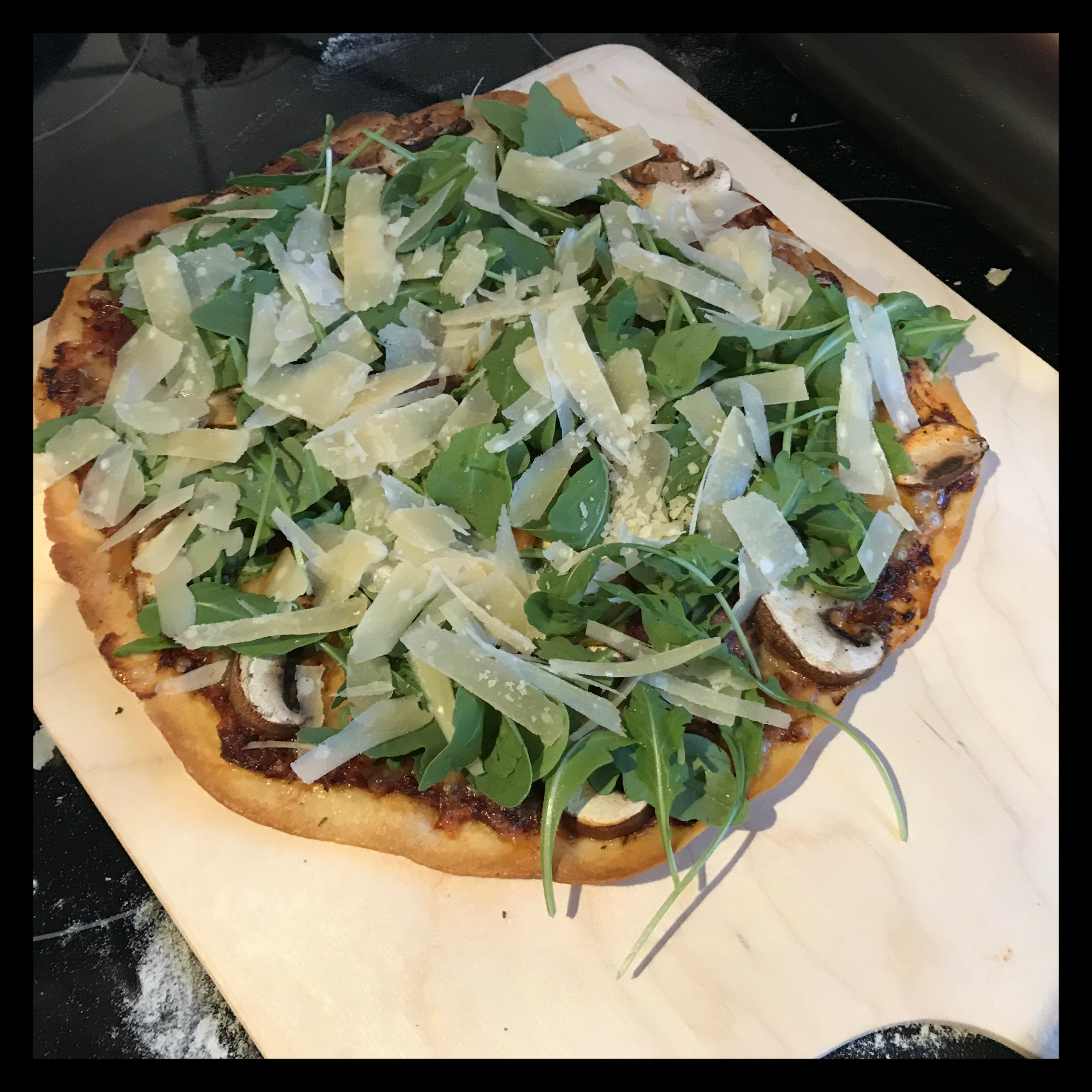 250 g Weizenmehl (Typ 00 für Pizza!) untermischen und zu einem glatten Teig verkneten, an warmer Stelle etwa eine Stunde gehen lassen, dann kurz durchkneten und aus dem Teig 3 Kugeln formen, in Frischhaltefolie wickeln und etwa einen Tag im Kühlschrank ruhen lassen