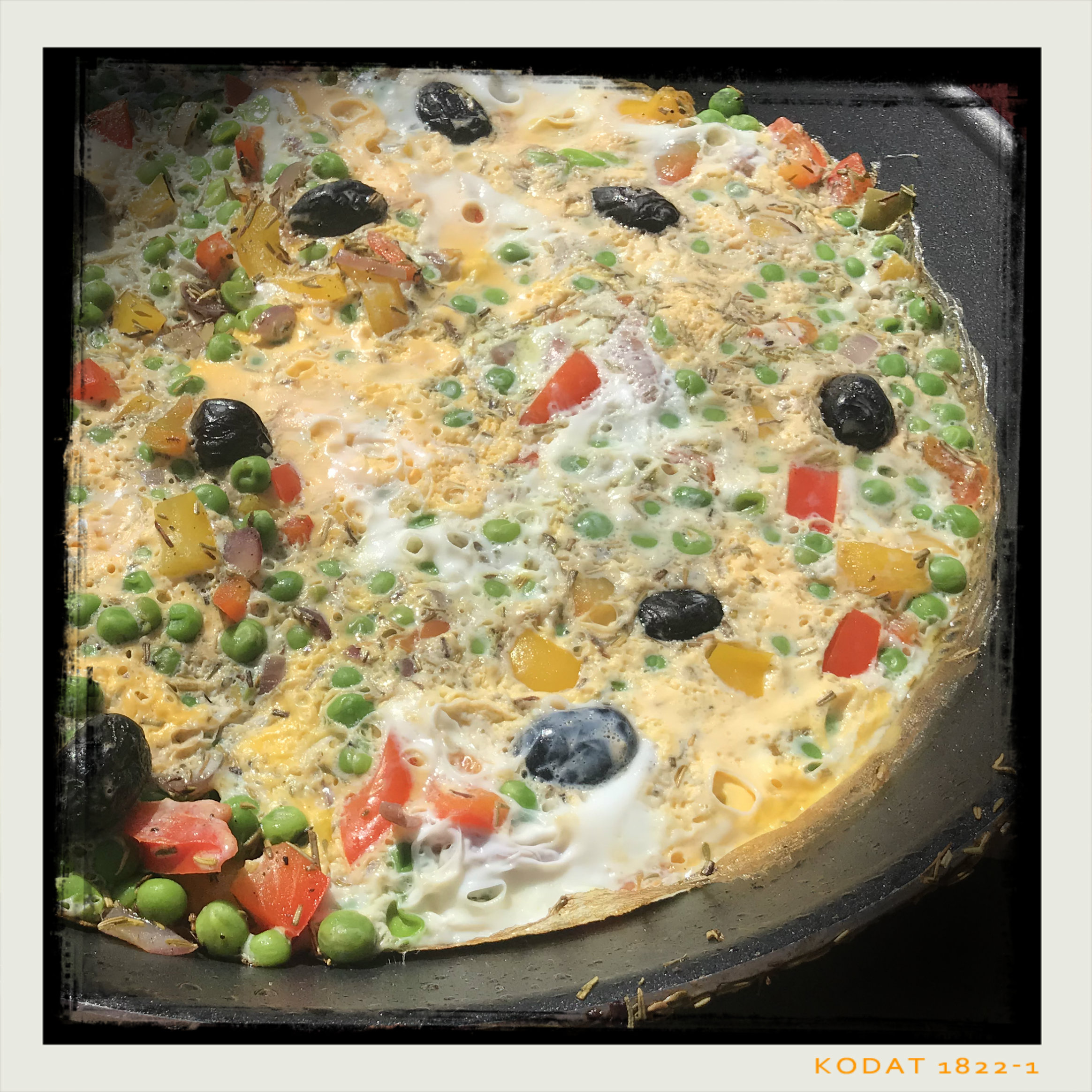 frisch gemahlenem schwarzen Pfeffer würzen und die Pfanne sofort mit dem Deckel schließen, auf mittlere Hitze herunterschalten und ein paar Minuten garen, bis die Eier gestockt sind