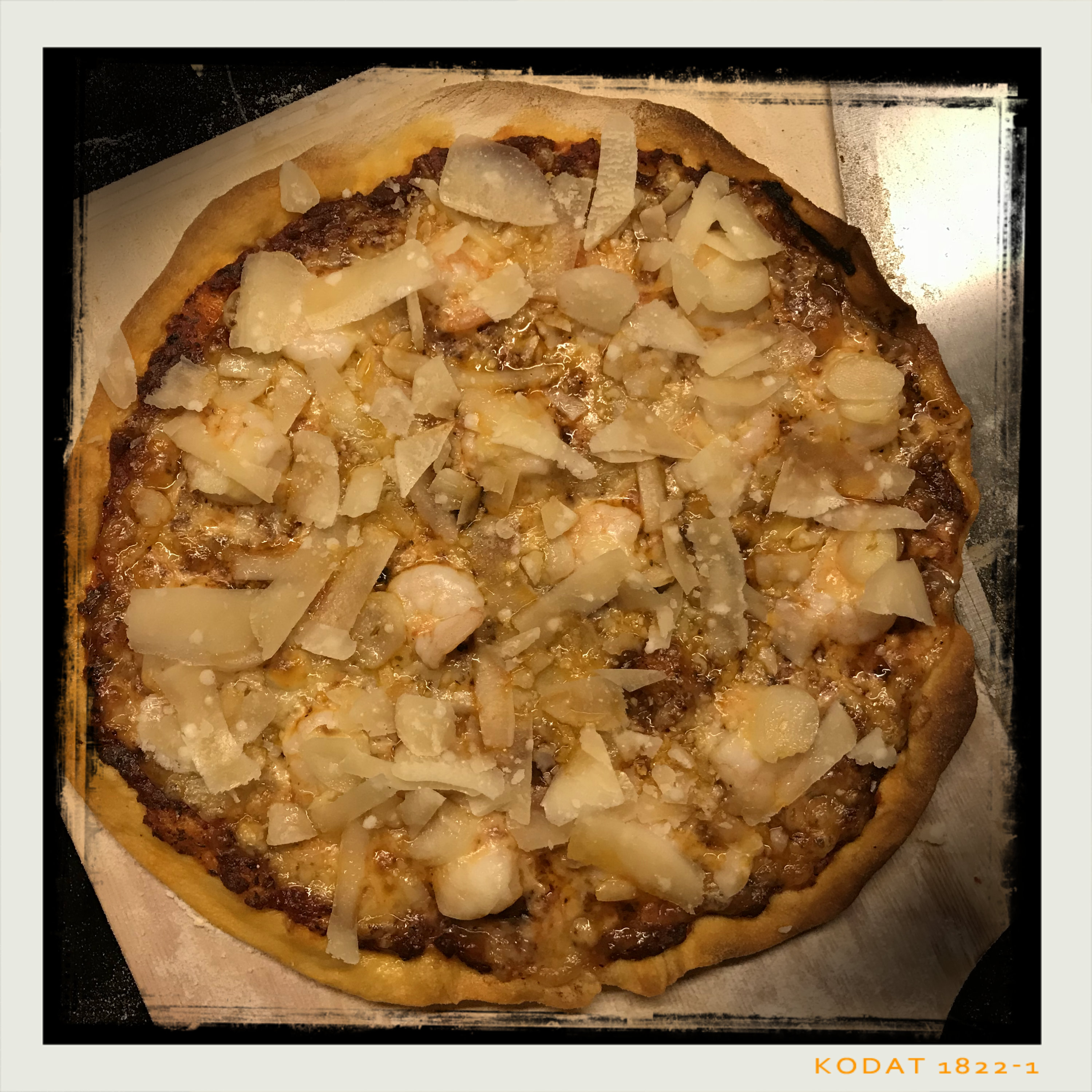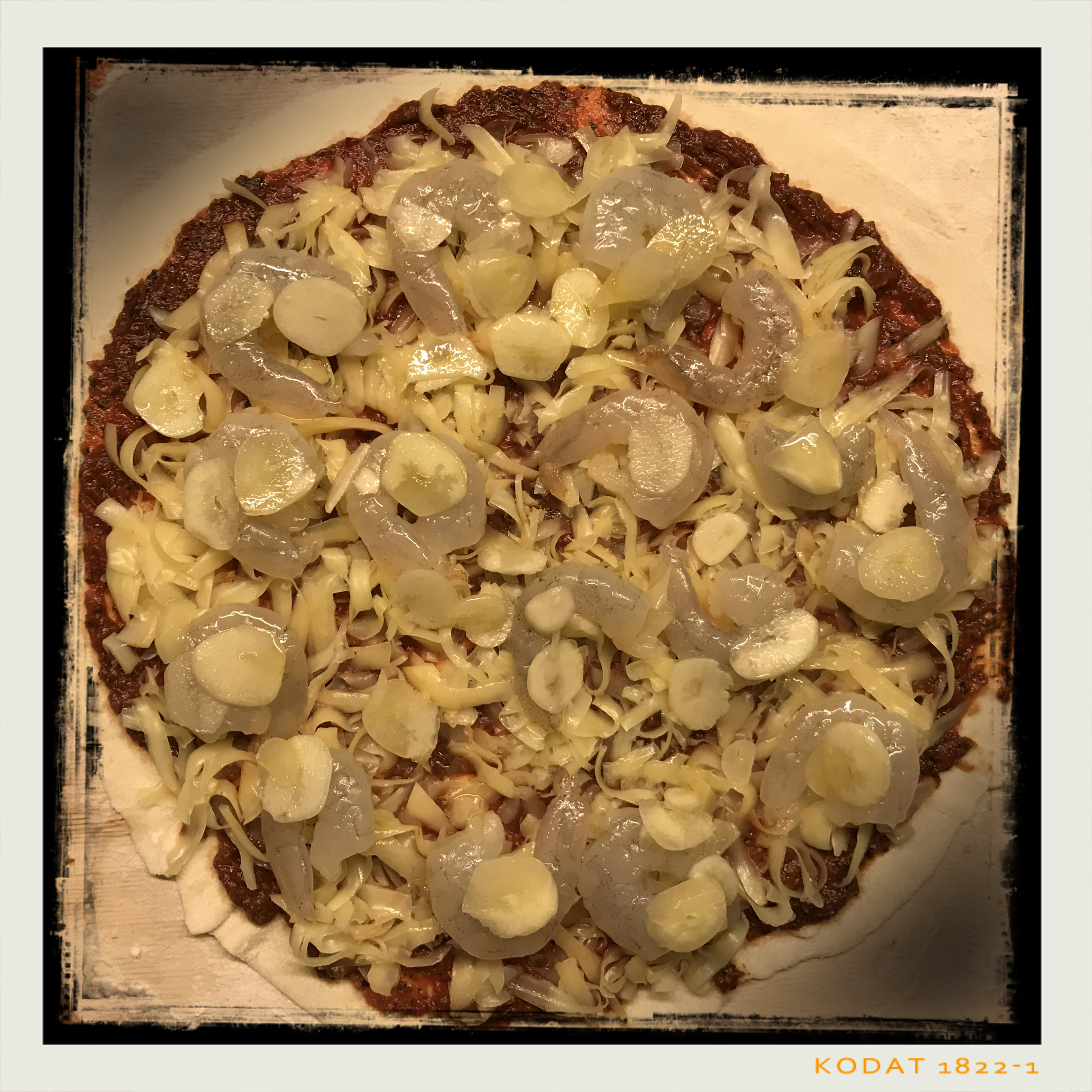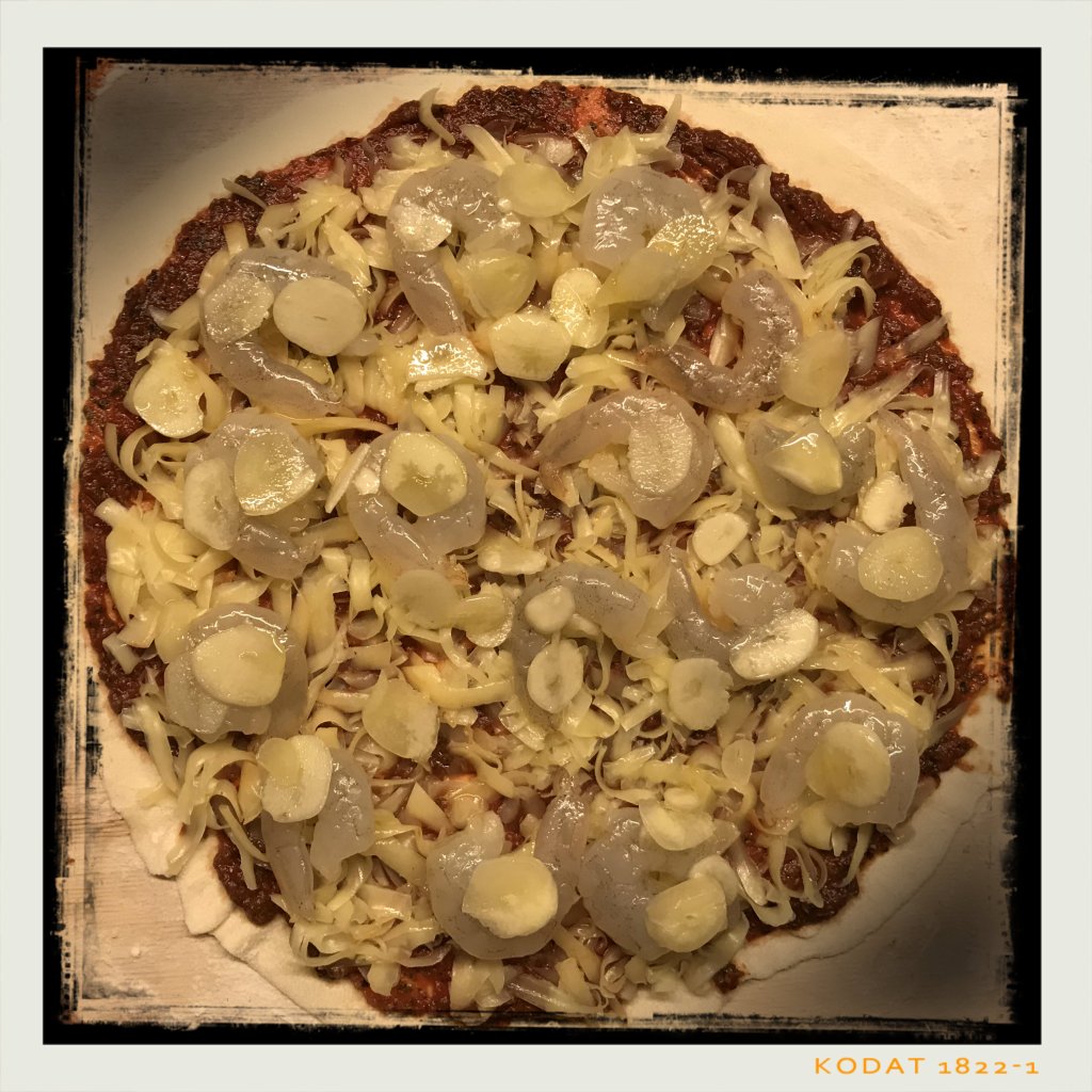 bemehlten Pizzaschieber gleichmäßig dünn ausrollen, mit der Tomatensauce bestreichen und den Emmentaler darauf verteilen, das Öl von den Garnelen tupfen, dann die Garnelen mit dem Knoblauch auf dem Käse verteilen, alles mit