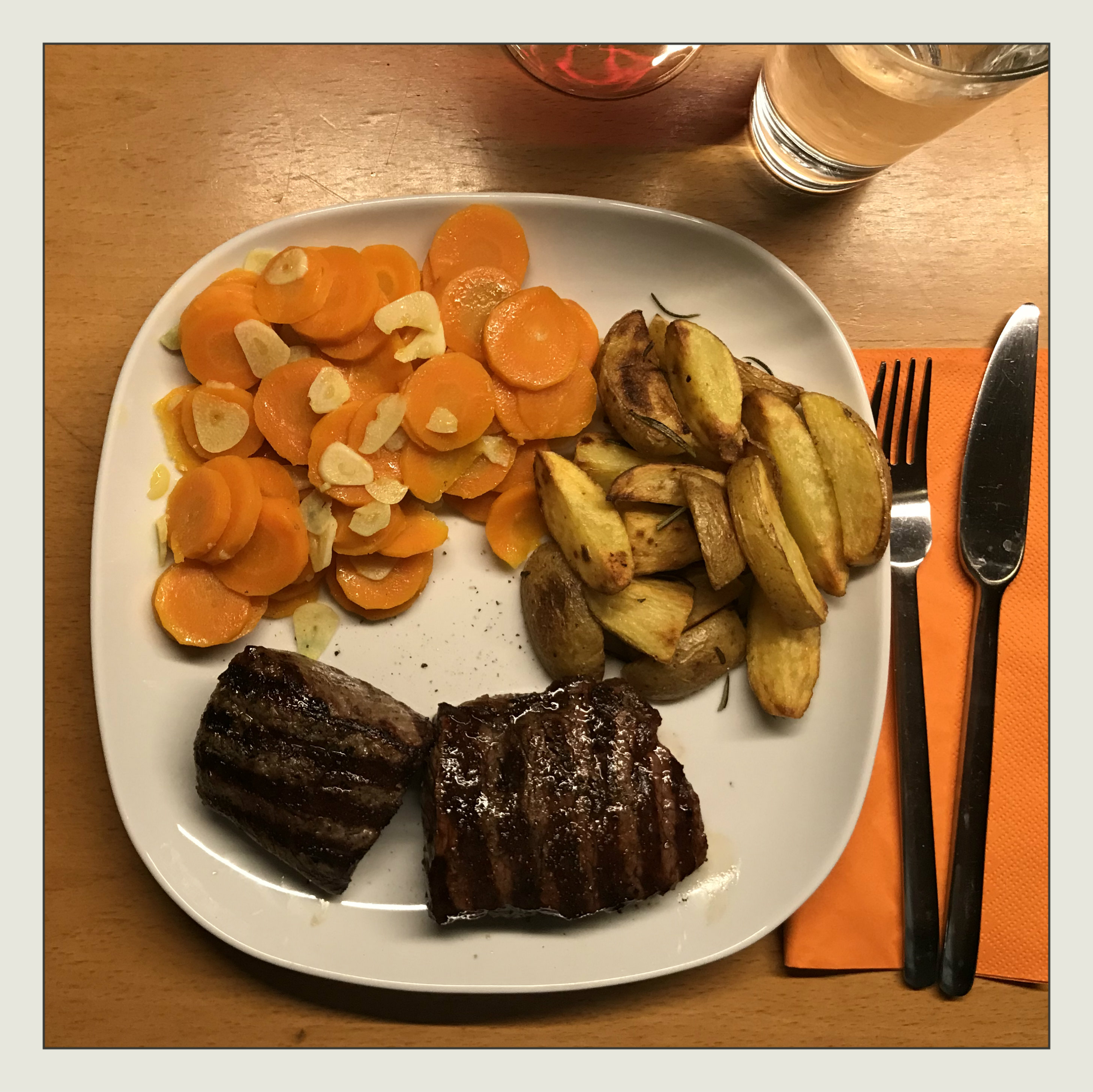 den Kartoffeln und den Möhren auf vorgewärmte Teller geben