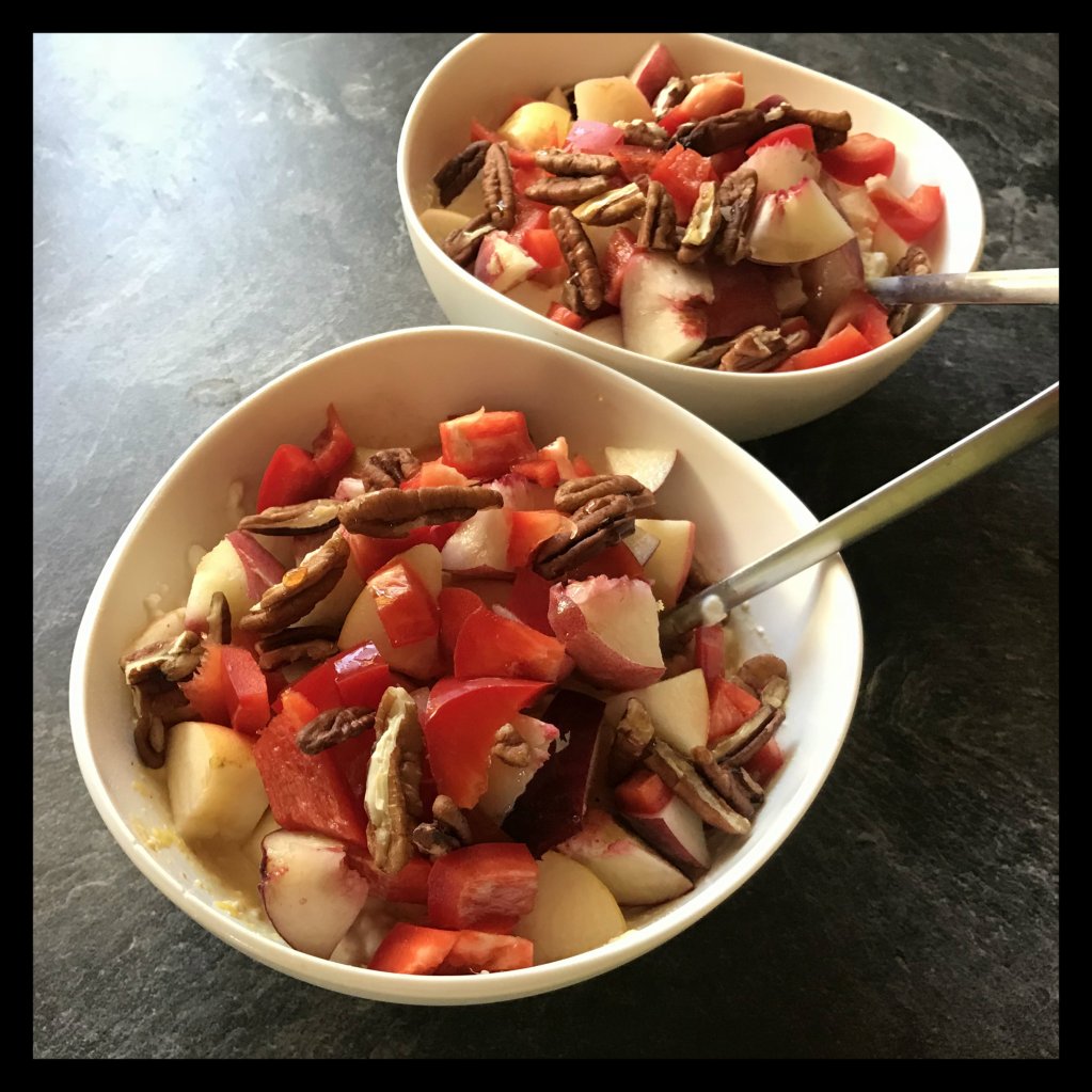 1 kleinen Apfel in kleinere Stücke schneiden und auf den Hüttenkäse geben, dann mit