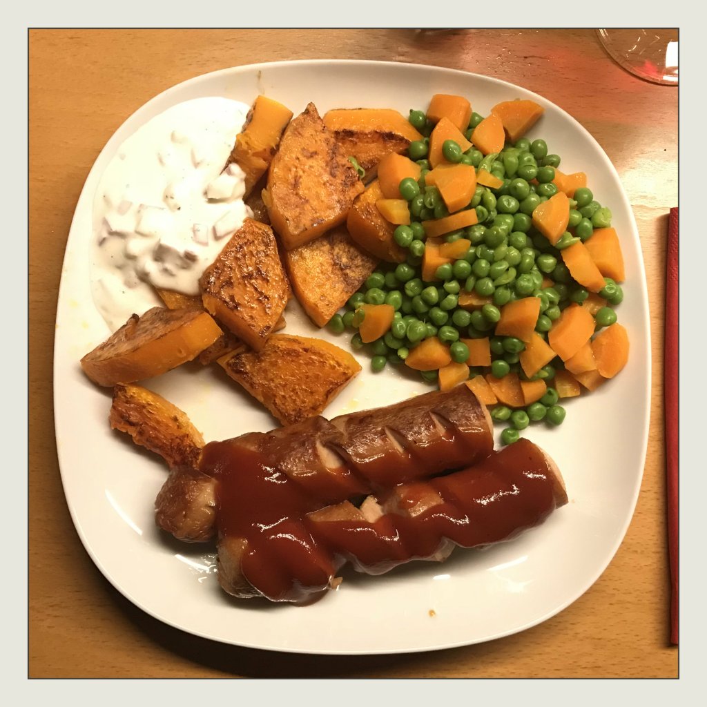 die Currywürste mit den Gemüse, dem Butternut, dem Sauerrahmdip und
