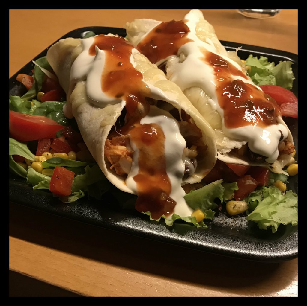 die fertigen Enchiladas auf dem Salat anrichten, die Zahnstocher entfernen, saure Sahne und