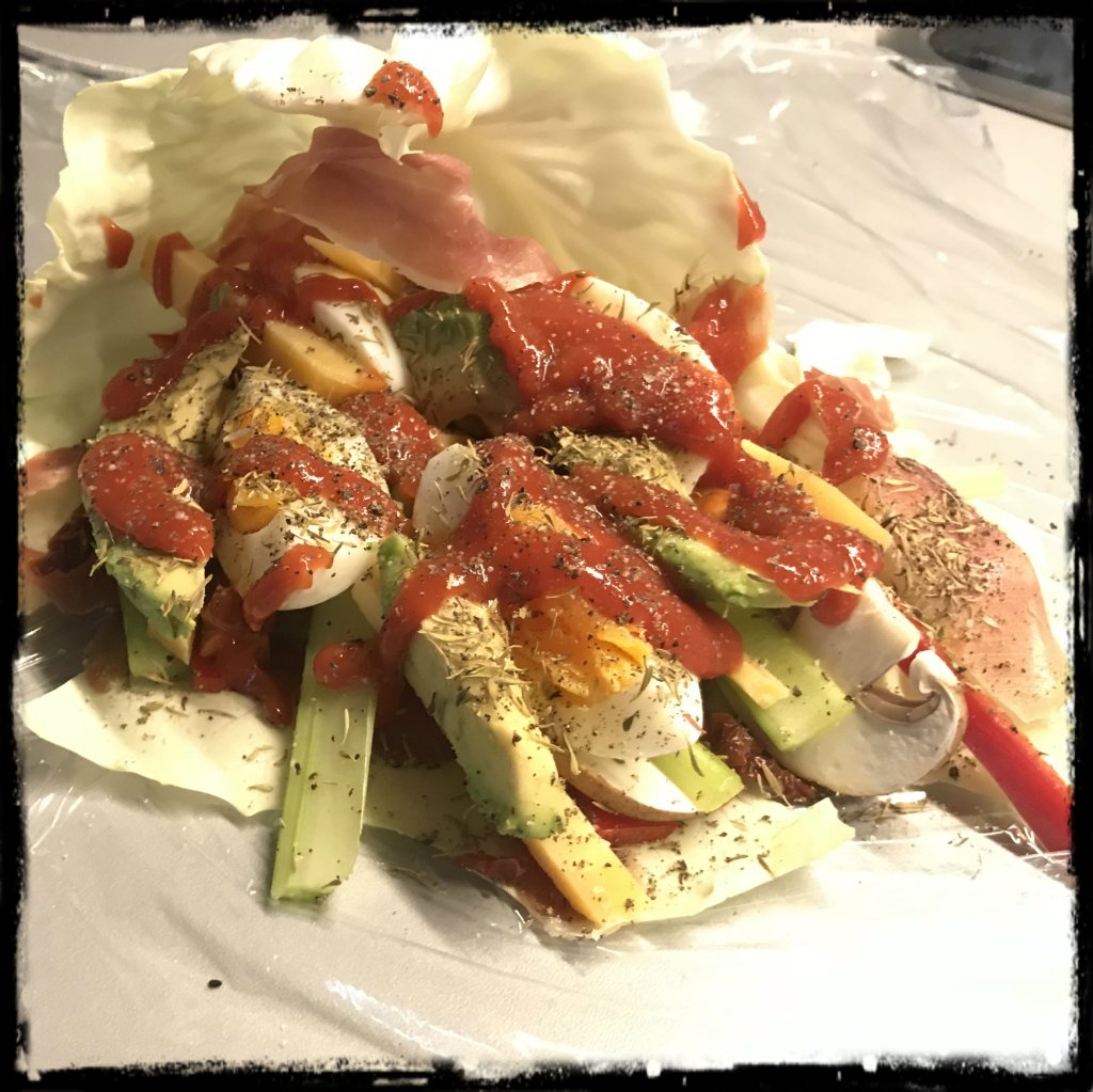 1 weiteren Blatt Weißkohl zu einem Wrap fest zusammenrollen und in