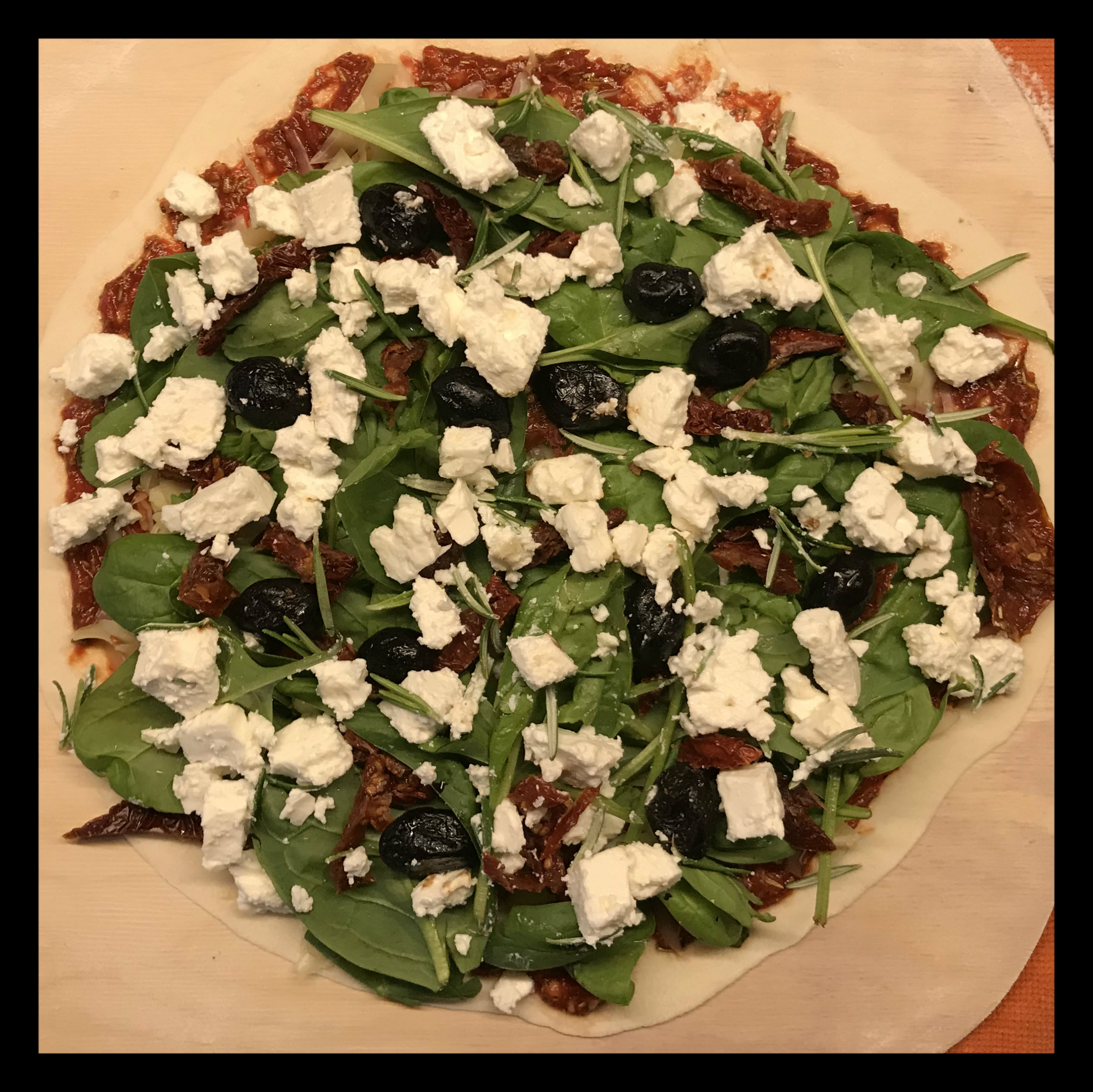 30 g Babyspinat, dem Feta, den getrockneten Tomaten und
