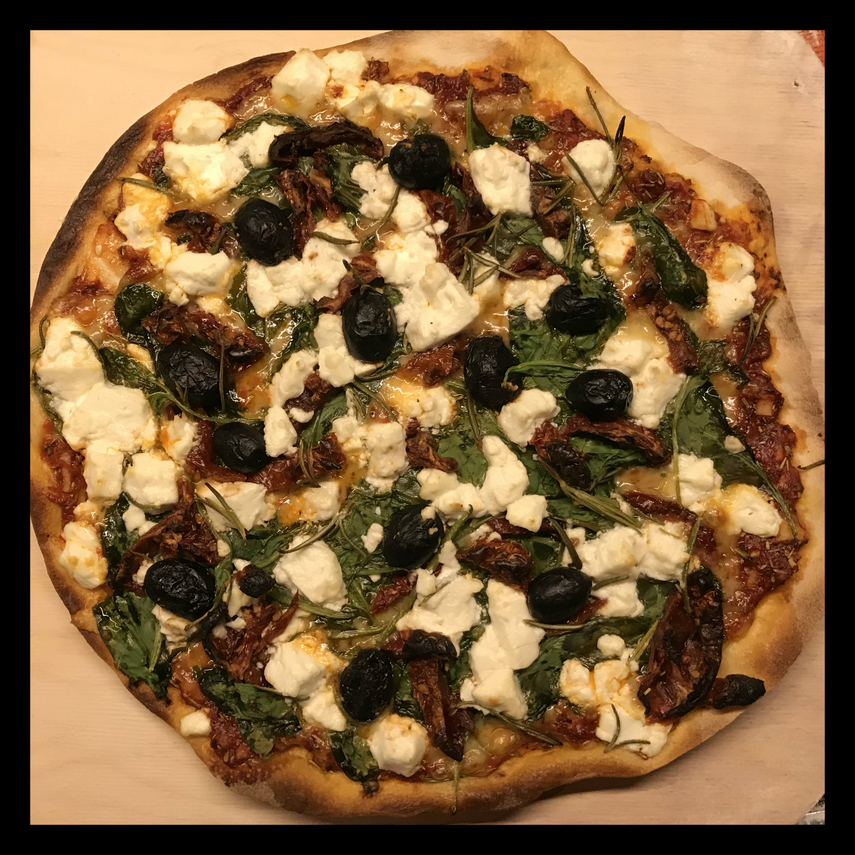 die Pizza auf den Stein gleiten lassen und bei 250 Grad ca. 7 1/2 Min., bei 300 Grad ca. 6 Min. und ohne Stein ca. 12 Min. backen